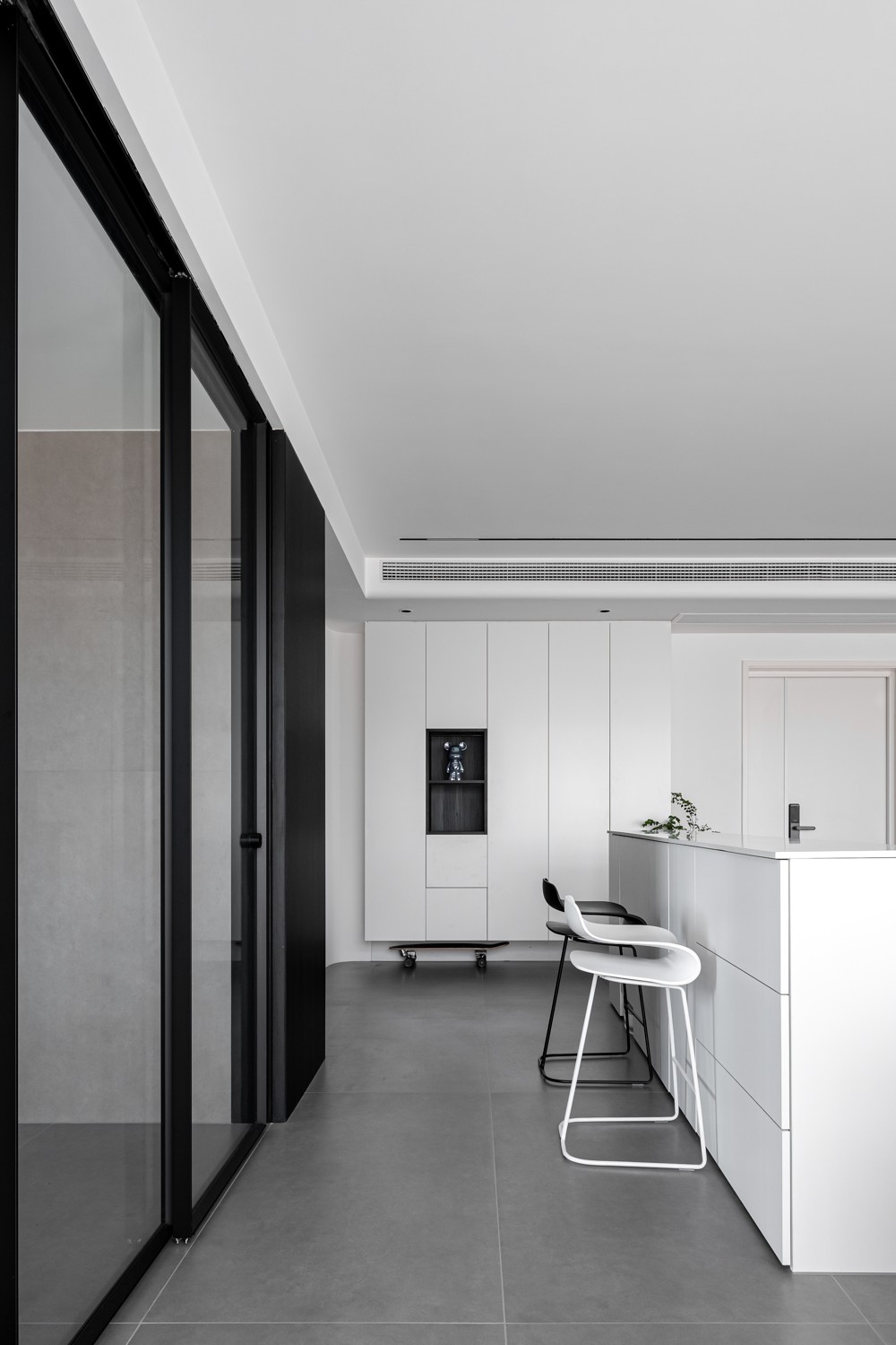 纯白柜体与深灰台面撞出“冷静的烟火气”,嵌入式厨电把琐碎藏进墙里,U型台面让备菜、烹饪、盛盘动线像“自动巡航”。黑框窄窗把窗外的光裁成条,落在干净的台面上,连锅铲碰撞声都变得轻快。