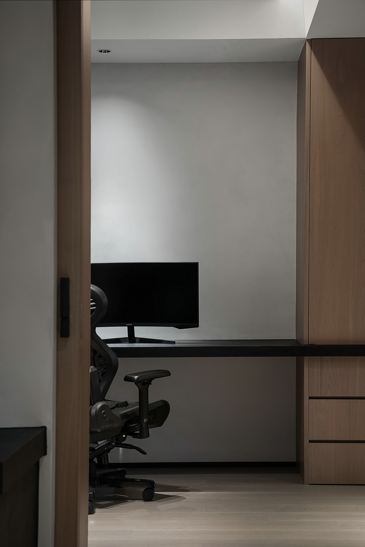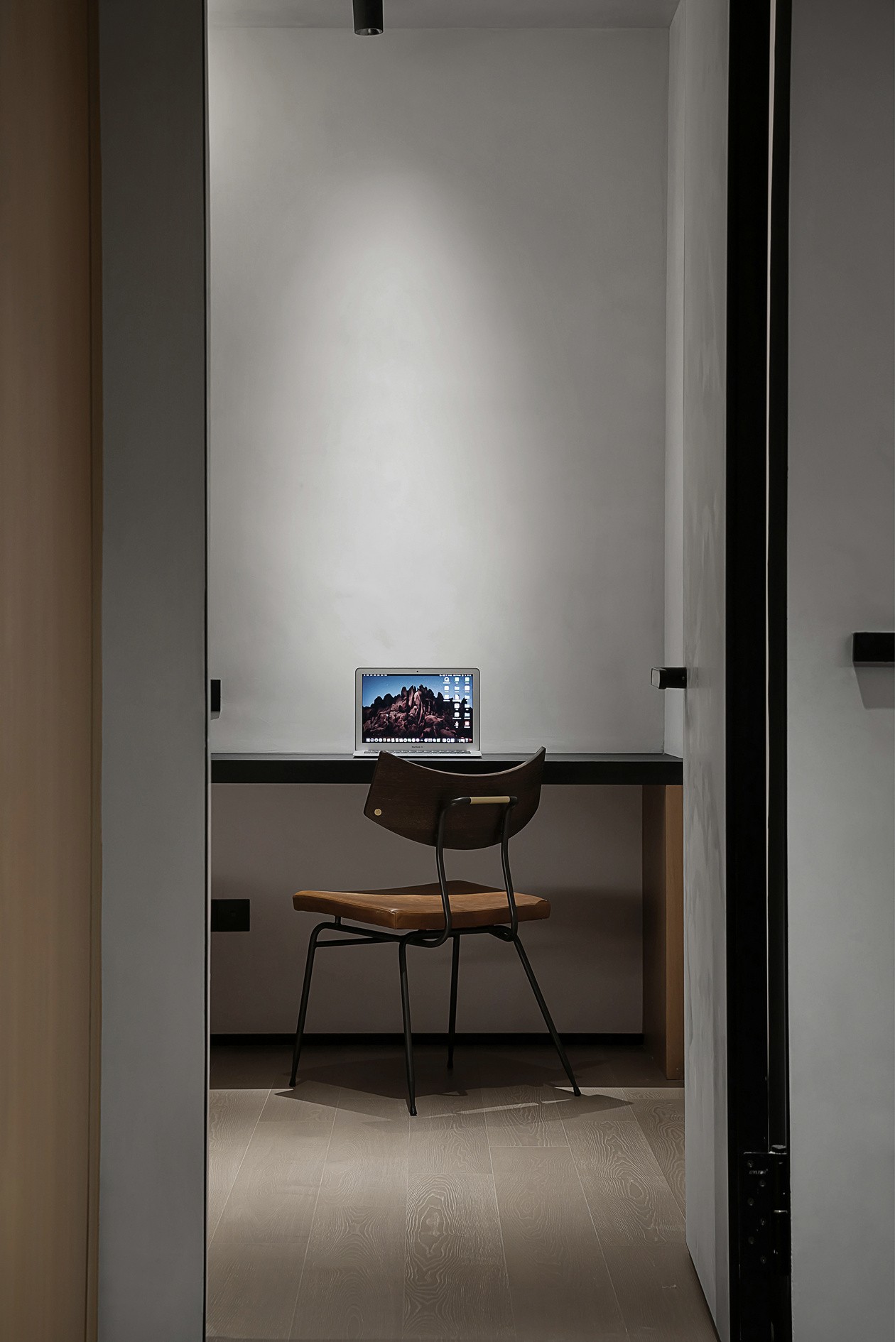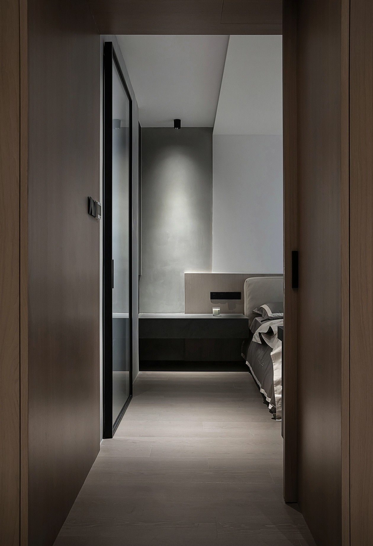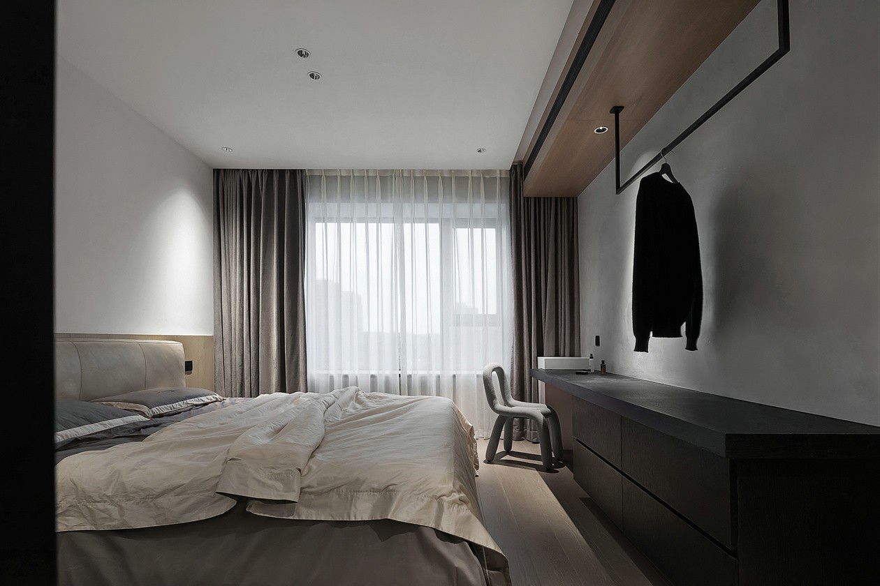 浅米床品像“刚晒过的云朵”,靠在木饰面床头板上,连呼吸都软下来。墙侧的悬浮长桌,既是梳妆台也是书桌,挂衣杆随手搭件毛衣,冷调空间里多了“有人住的温度”。纱帘滤过的光,把整个房间裹成“只属于自己的松弛胶囊”。