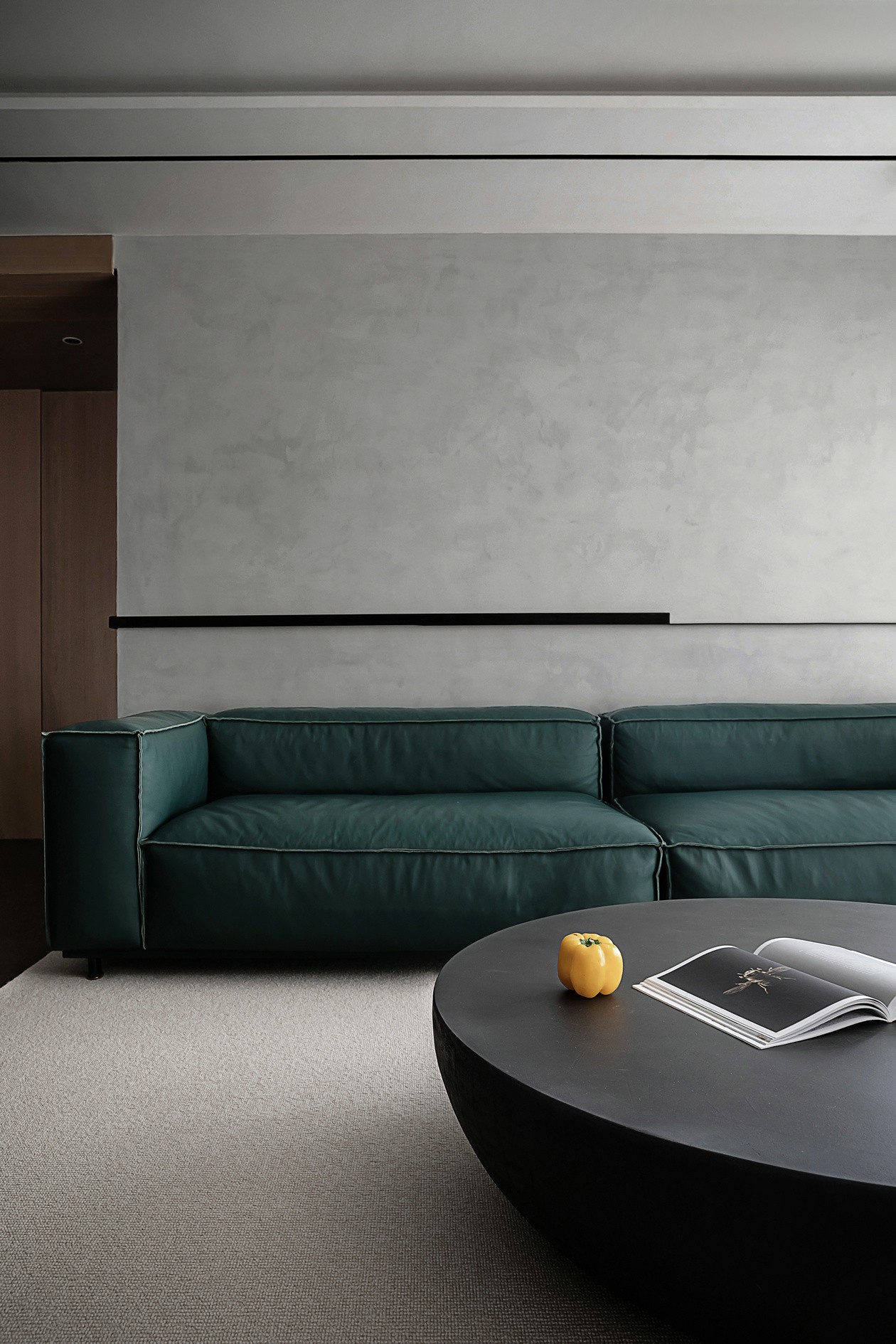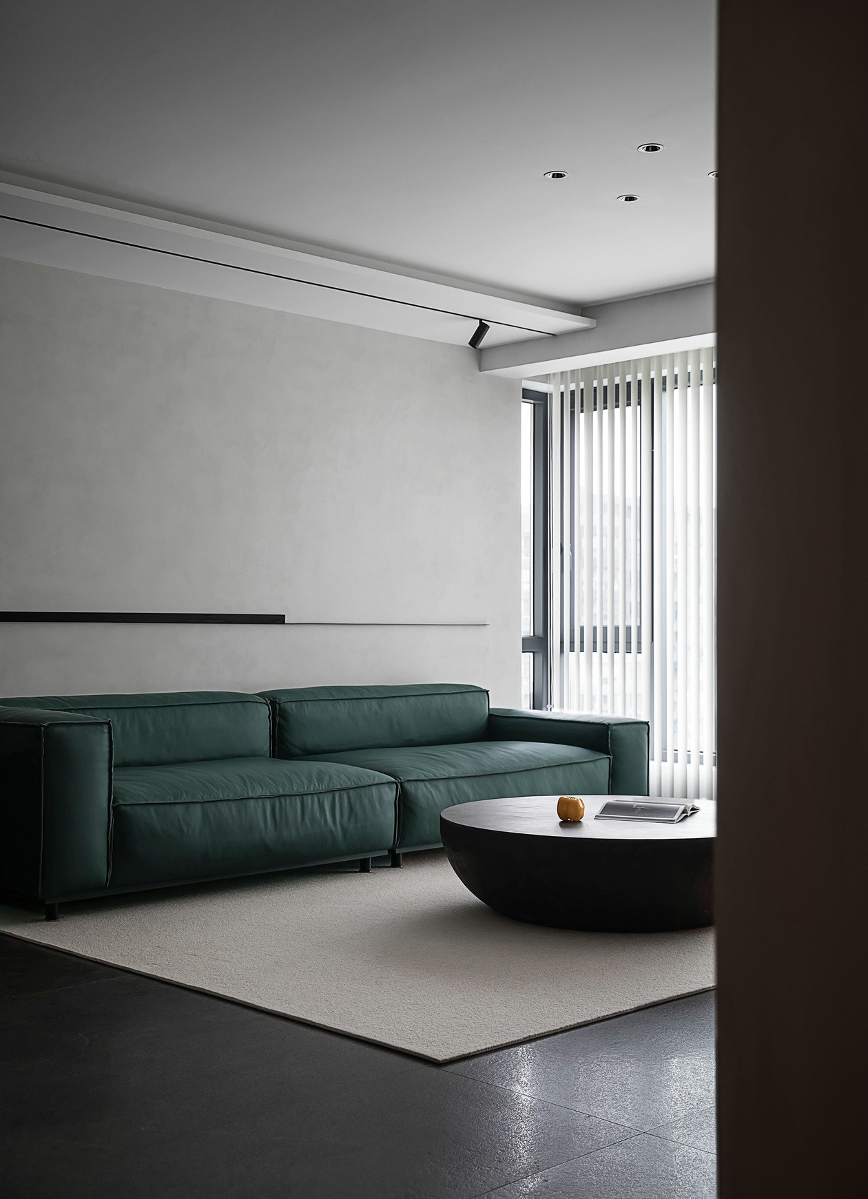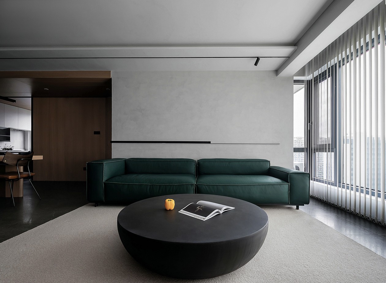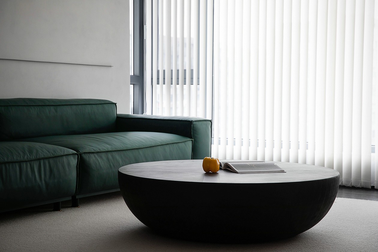水泥肌理墙是“冷调画布”,墨绿色皮质沙发是点睛的重彩,软包的褶皱裹着慵懒,往上面一陷,连时间都慢下来。圆形黑茶几像块“沉默的陨石”,摆上杂志和黄椒,冷调里蹦出点鲜活气。竖百叶帘把天光切成细条,落在浅绒地毯上,整个空间都裹着“不刺眼的高级”。