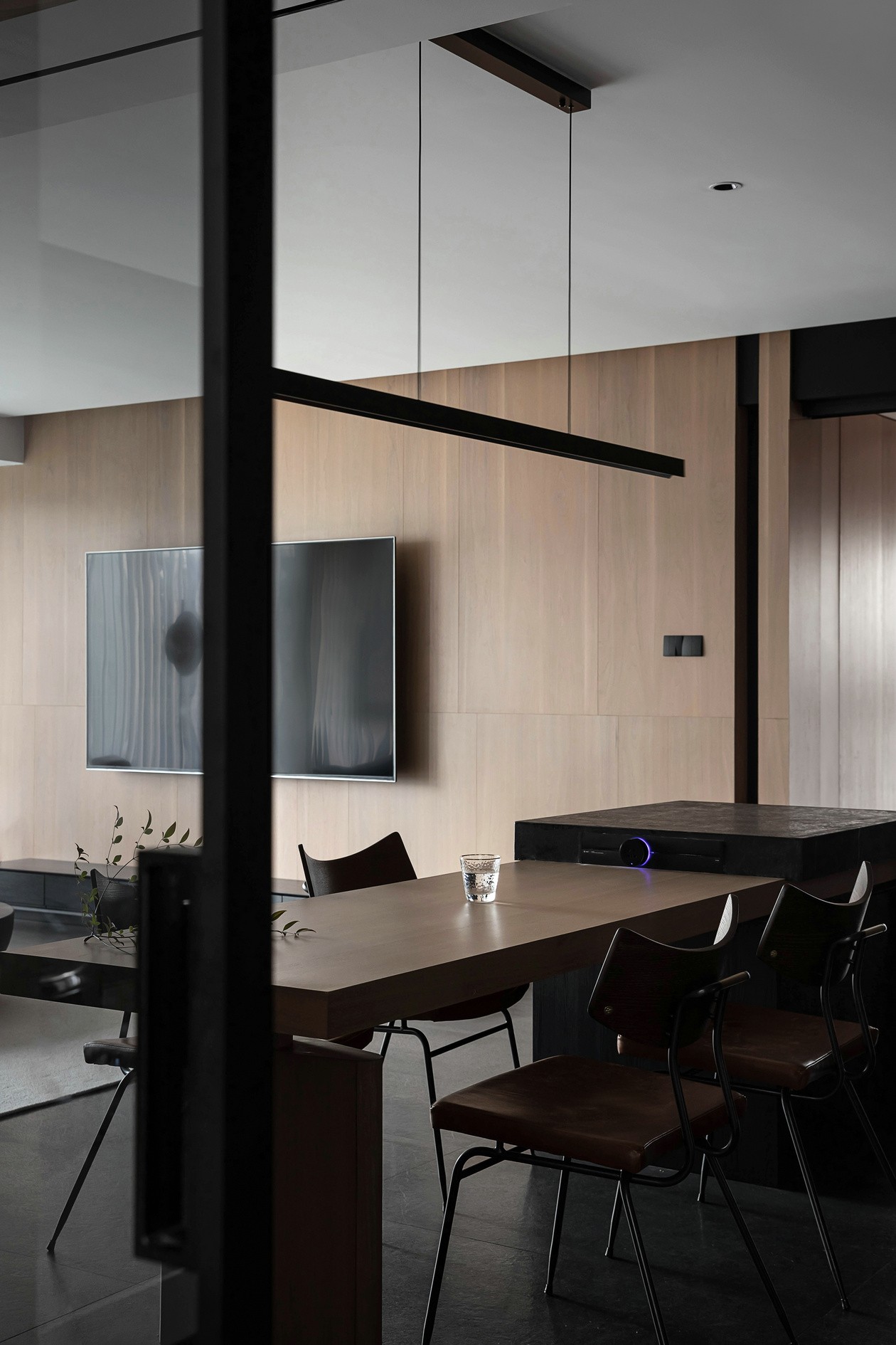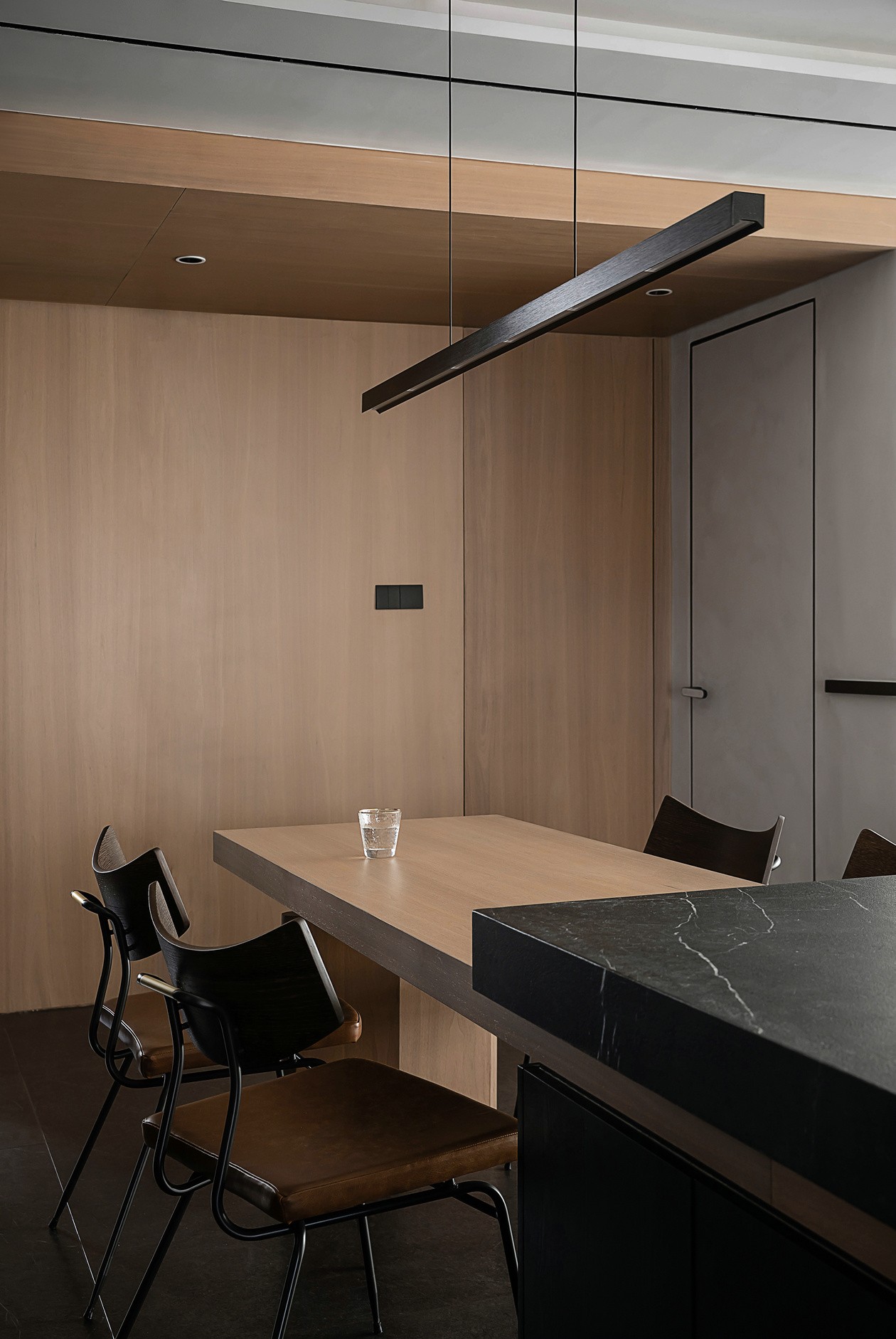 深灰石纹岛台搭原木餐桌,是“冷硬”与“温软”的握手——岛台藏着收纳,餐桌能容下聚餐的热闹。木色餐椅的皮质软包,是“坐下去就不想起来”的舒适,黑框玻璃门把厨房藏在后面,烟火气也变得利落。
