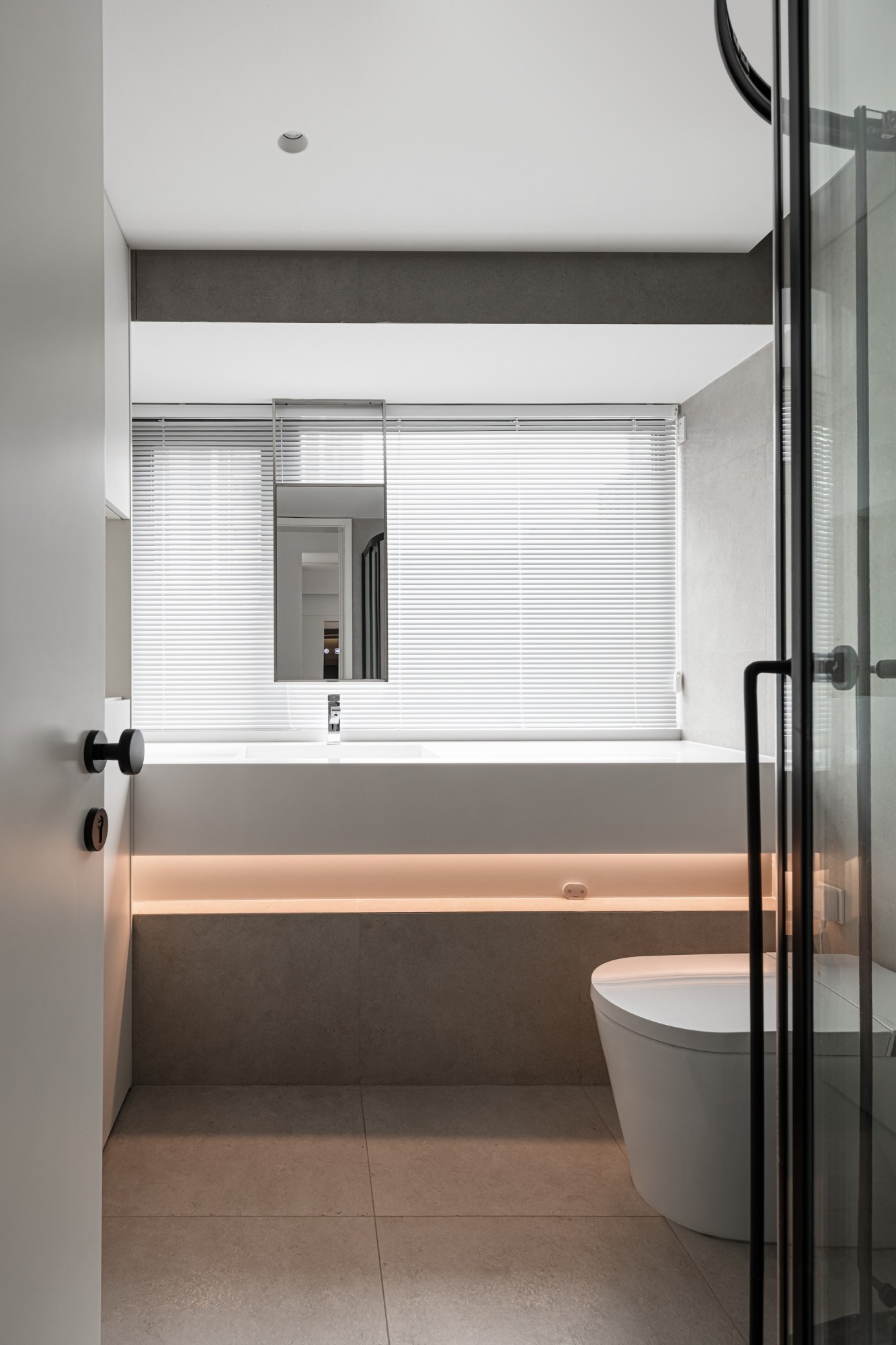 百叶窗滤过的柔光,让冷调瓷砖多了份暖;