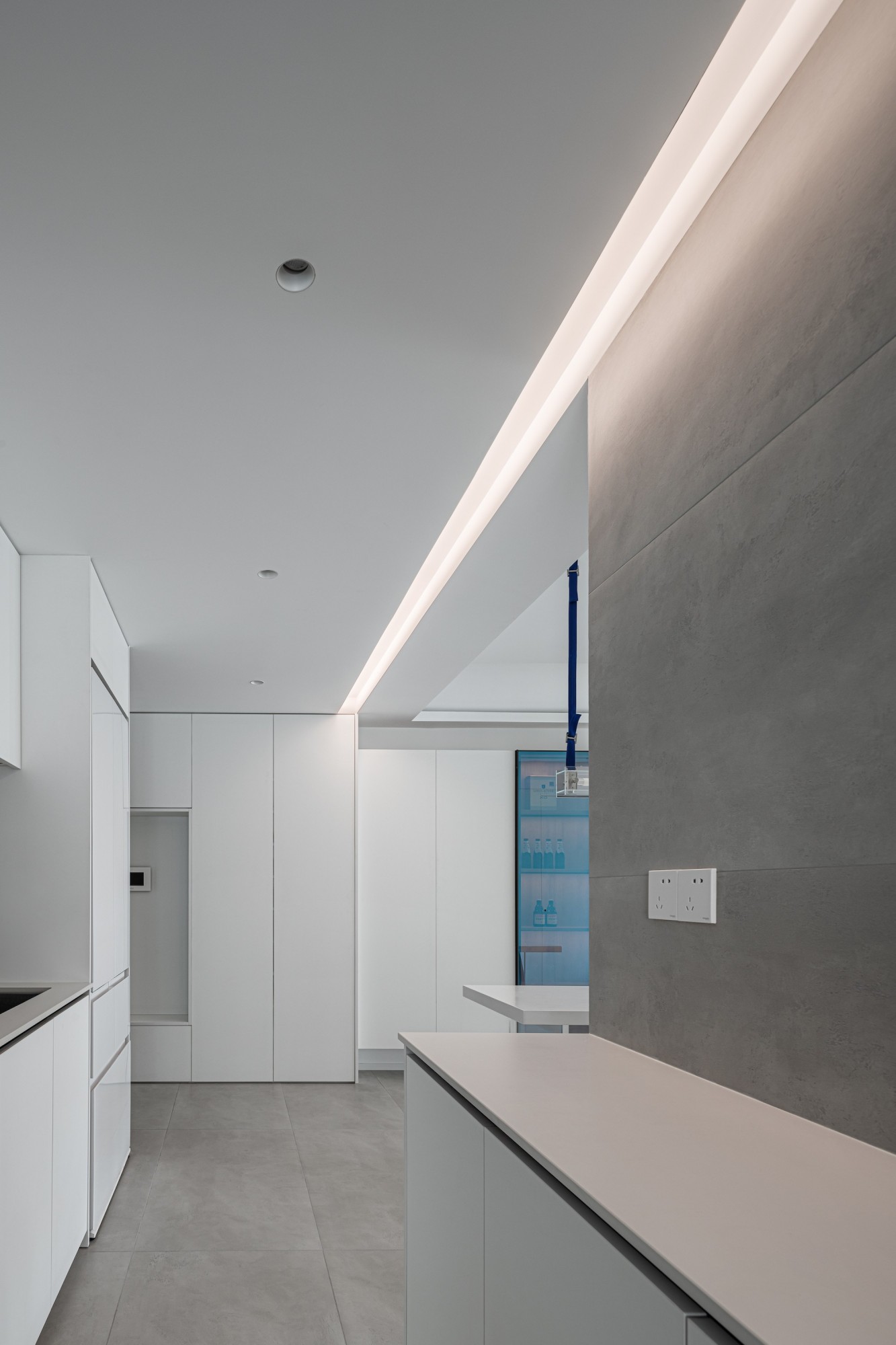 厨房用“全隐柜+无把手”藏起所有烟火气,台面与墙面的同色处理,让操作区干净得像幅极简画;
