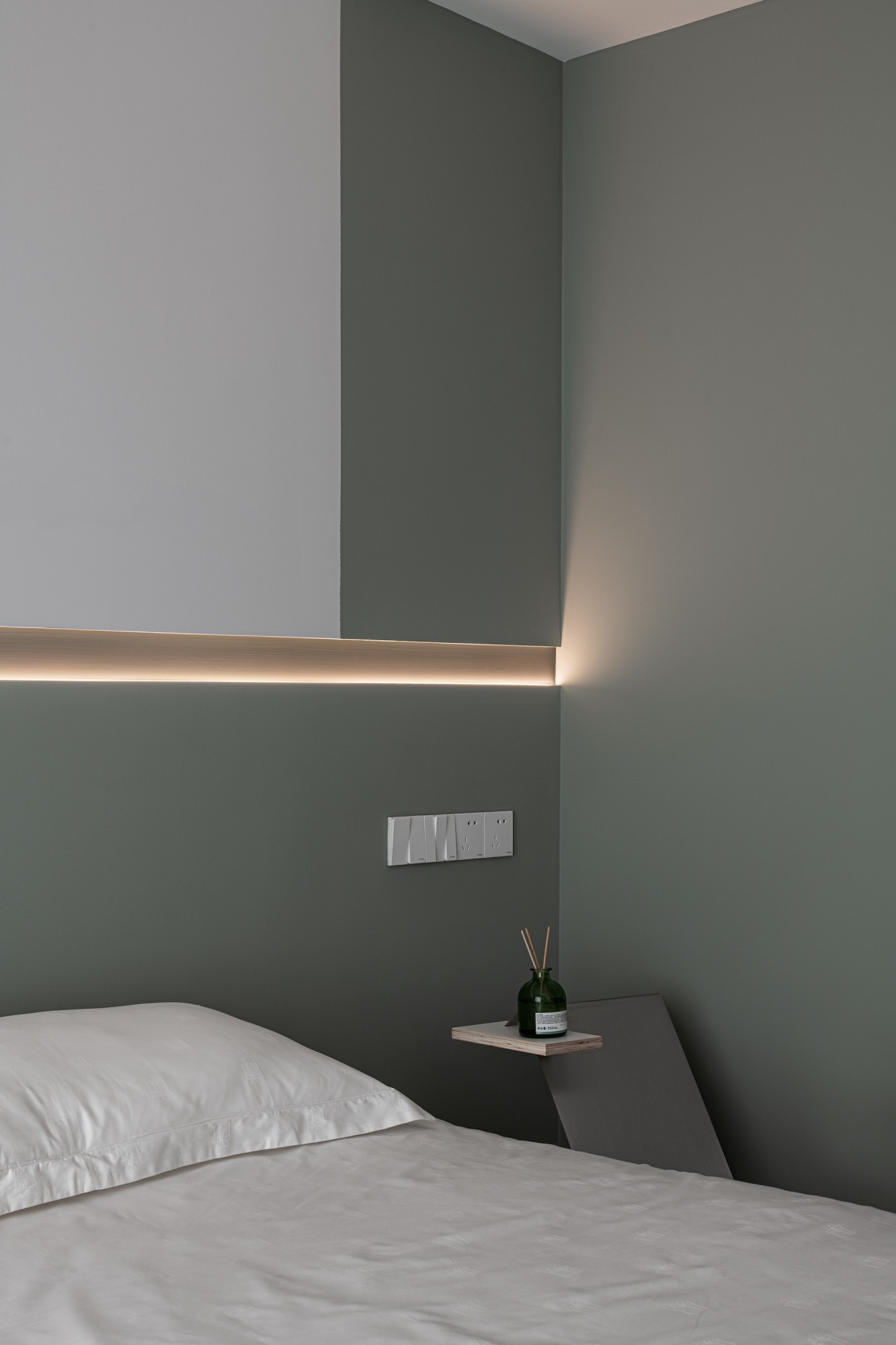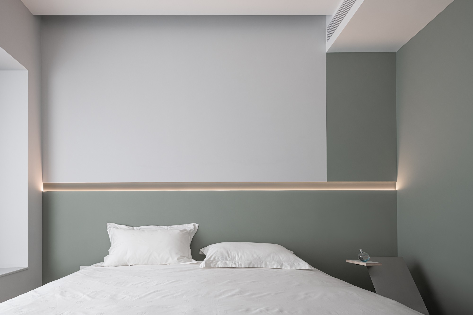灰白+浅绿的拼色墙,像把清晨的雾色搬进了房间;