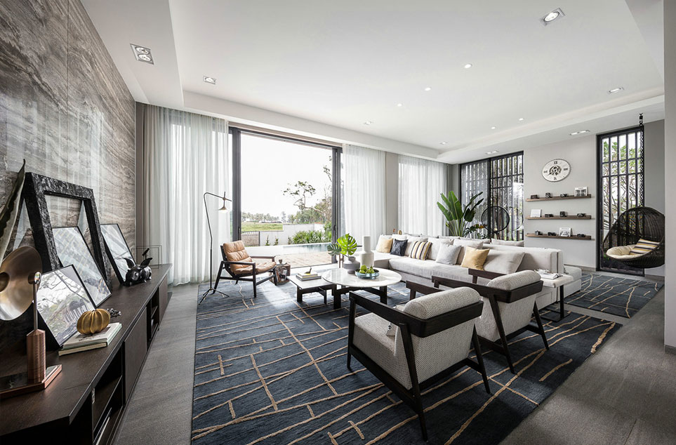 柔软的沙发与岩板圆茶桌增添了几分时尚的轻奢格调,眺望室外花园美景,体验别样的闲适