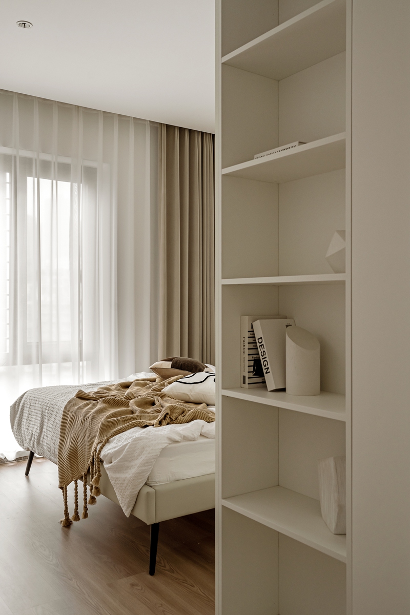 浅灰床头与棉麻床品,在光影中晕出慵懒质感;棕色针织毯的肌理,为空间增添触觉温度。床边小几的大理石纹理与极简造型,让“休憩”也成为兼具美学与舒适的体验,每一个清晨与夜晚,都在此被温柔接住。
