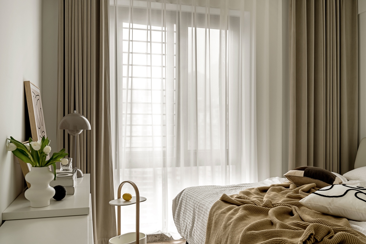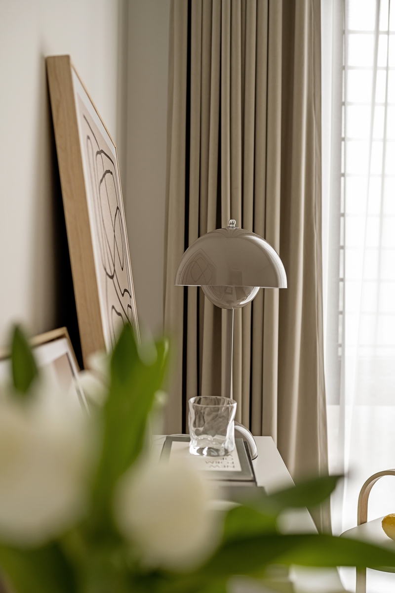 米杏色沙发如同被阳光晒暖的软云,搭配几何感黑白地毯,让空间在柔和中透出利落。白色护墙板以极简线条勾勒秩序,透光纱帘滤过的光线,让整个客厅成为“可呼吸”的松弛容器,静坐于此,便能感知时光的慢淌。