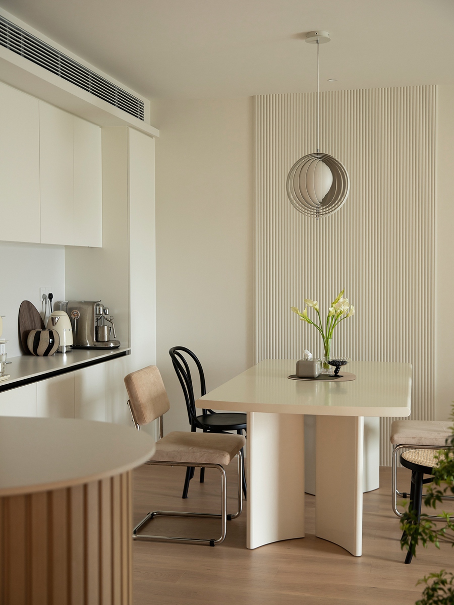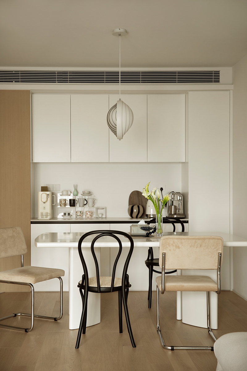 开放式餐厨以白调橱柜营造清爽感,个性吊灯如艺术装置点亮空间;不同材质的餐椅混搭出随性趣味,咖啡器具与鲜花错落陈列,让下厨、用餐都成为值得慢享的日常仪式。