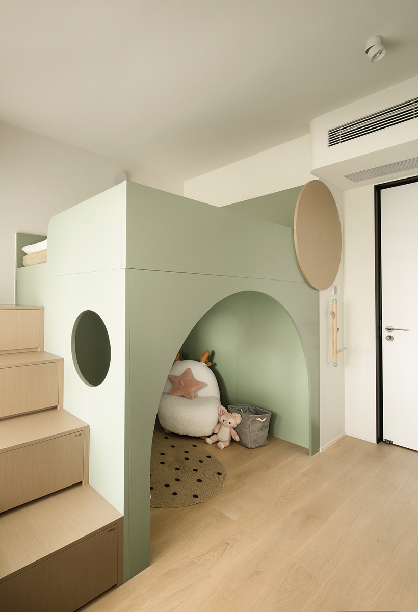 薄荷绿“树屋式” bunk 床是童年的魔法空间,阶梯式收纳与拱形玩耍区,让睡眠、储物、游戏自然融合,柔软玩偶与圆润设计,守护孩子天马行空的成长时光。