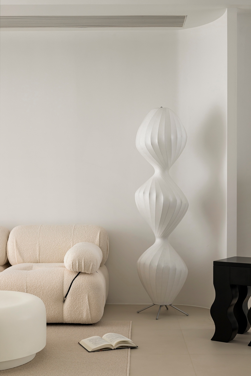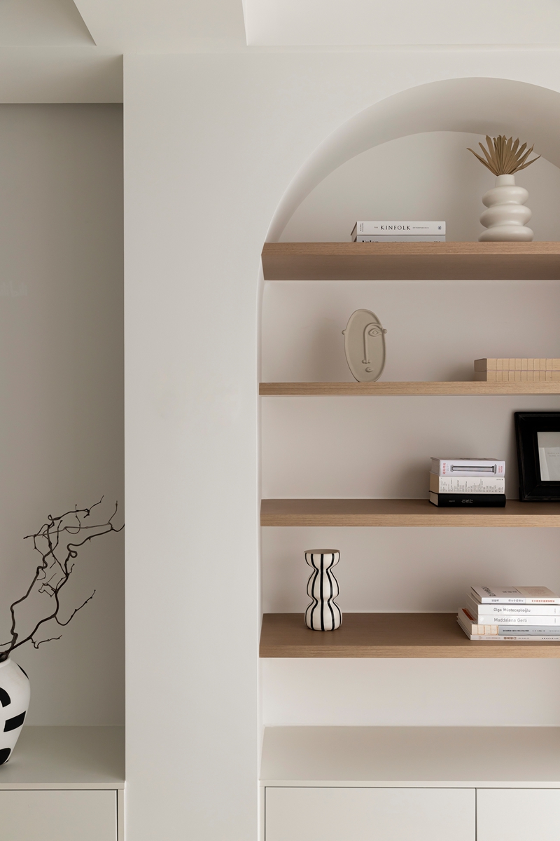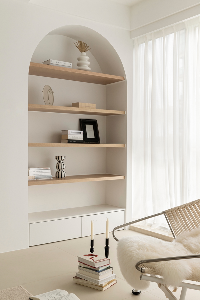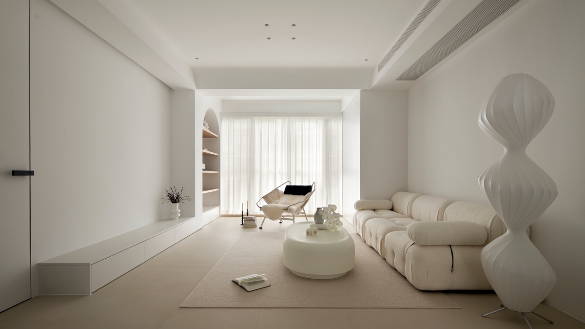 全白基底如一张干净画布,毛绒沙发的柔软弧度、异形茶几的圆润轮廓,消解了极简的冷硬感;拱形置物架隐于光影中,艺术感落地摆件似抽象雕塑,阳光透过薄纱时,整个空间都在“什么都不刻意”的松弛里轻轻呼吸。