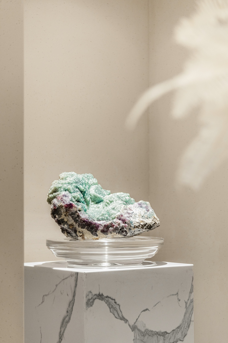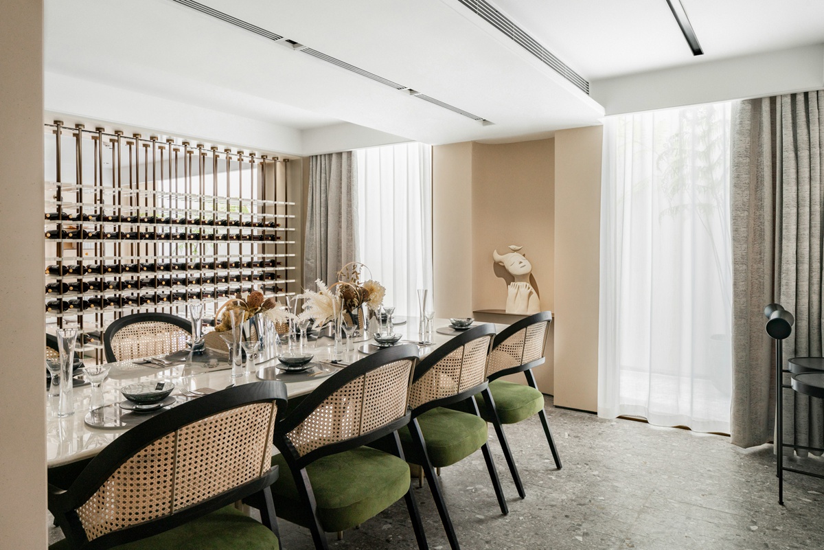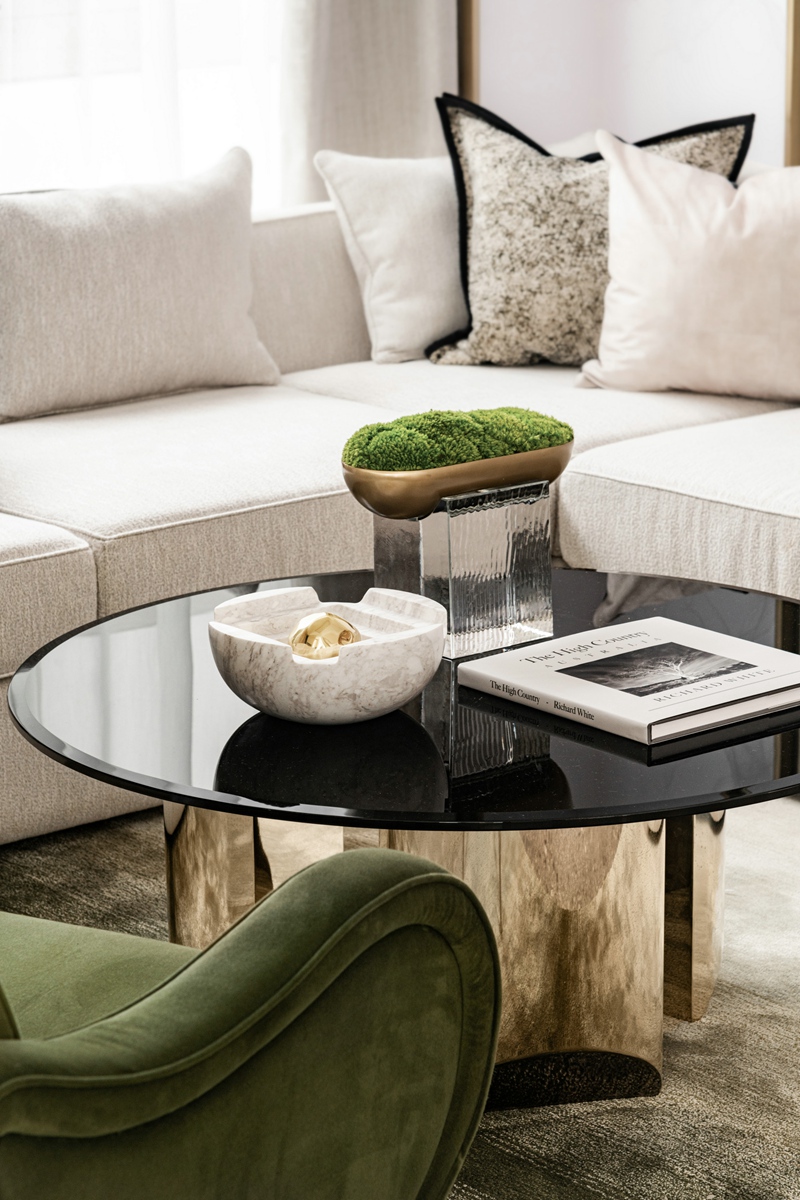 弧形吊顶如被柔化的时光轮廓,将光线温柔地铺陈在空间里。竖纹墙板的秩序感,与墨绿大理石的野性纹理碰撞出戏剧张力;橄榄绿单人椅如艺术雕塑,以大胆色彩打破米白沙发的沉静,而金属底座的玻璃茶几,让奢华感在光影折射中悄然流转——在这里,每一次落座都是与“优雅棱角”的亲密对话。
