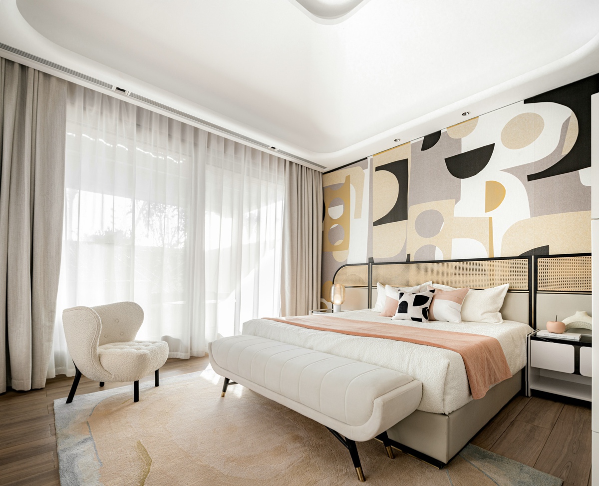 床头背景的抽象线条如黑胶唱片的纹路,将艺术张力延伸至休憩空间。墨绿绒面床品如森林暮色,包裹住床榻的柔软;藤编床尾凳的自然肌理,与金属灯具的冷光相映成趣,而通向卫浴间的动线里,大理石与木质的材质对话仍在延续——当野性设计遇见温柔触感,睡眠便成了与艺术共眠的奢享。
