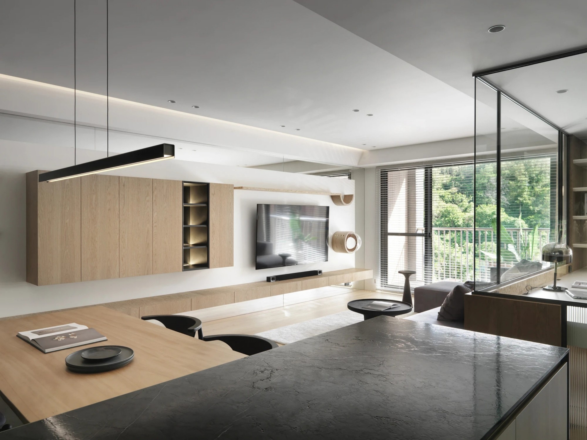 浅木色的柜体与地板勾勒出空间的温润底色,灰色L型沙发以慵懒姿态容纳生活的松弛时刻。无主灯设计让光线如呼吸般自然散落,玻璃隔断模糊了空间边界,却让通透感倍增。在这里,每一处线条都极简利落,每一抹色彩都克制内敛,猫咪的原木游乐区更添生活意趣,让简约空间漾起温暖涟漪。