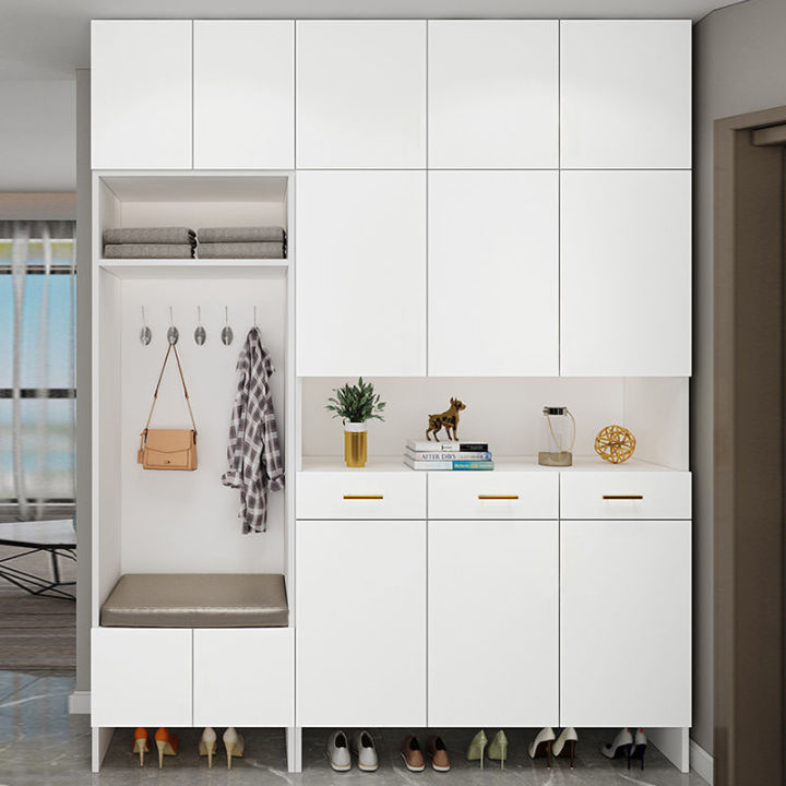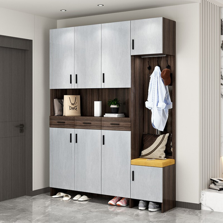 一体式的玄关柜,鞋柜+换鞋凳+挂衣区,增加储物能力并方便外出。