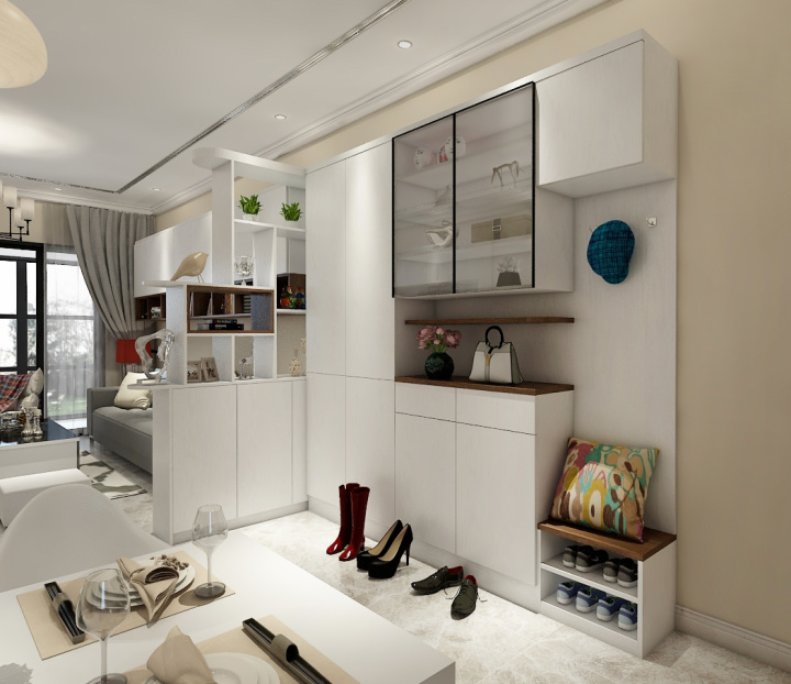 玄关柜在颜色的选择上不要太强烈,这样不会在一进门就给人造成视觉冲击。
