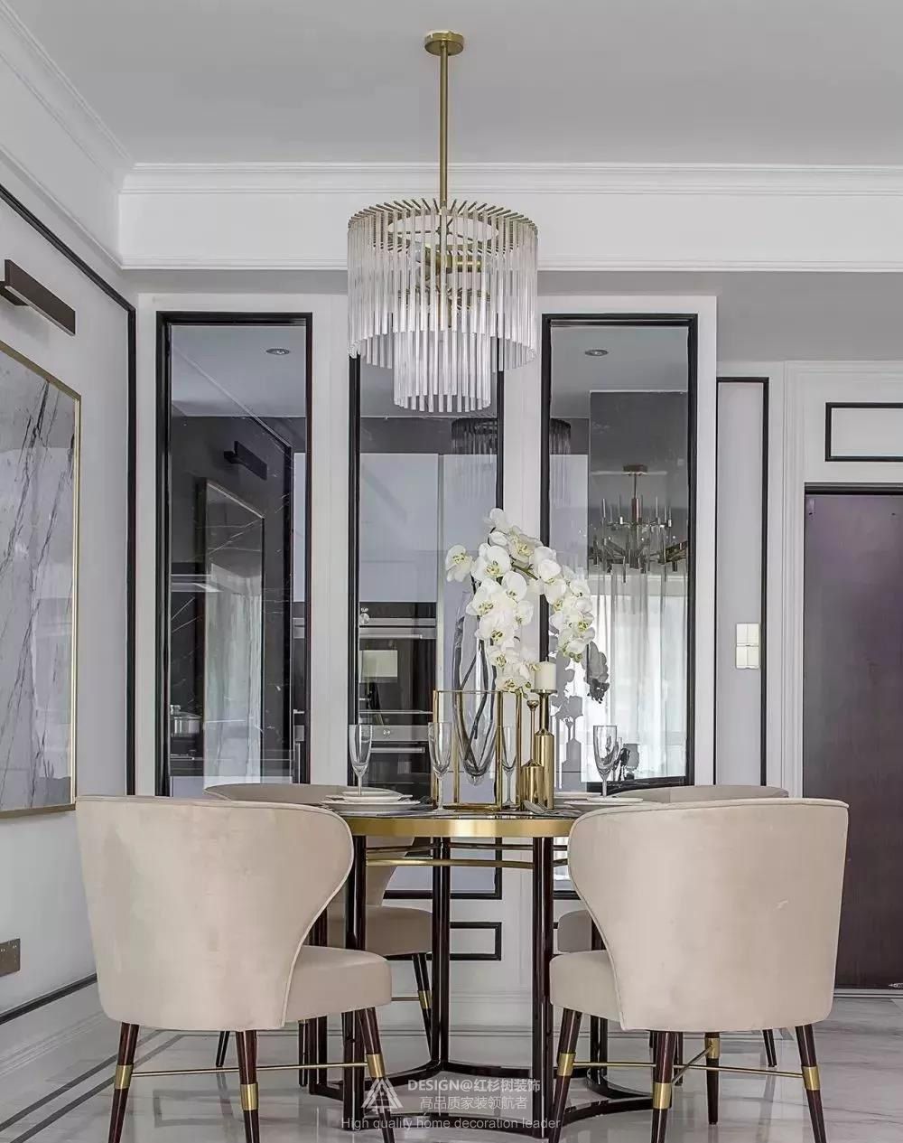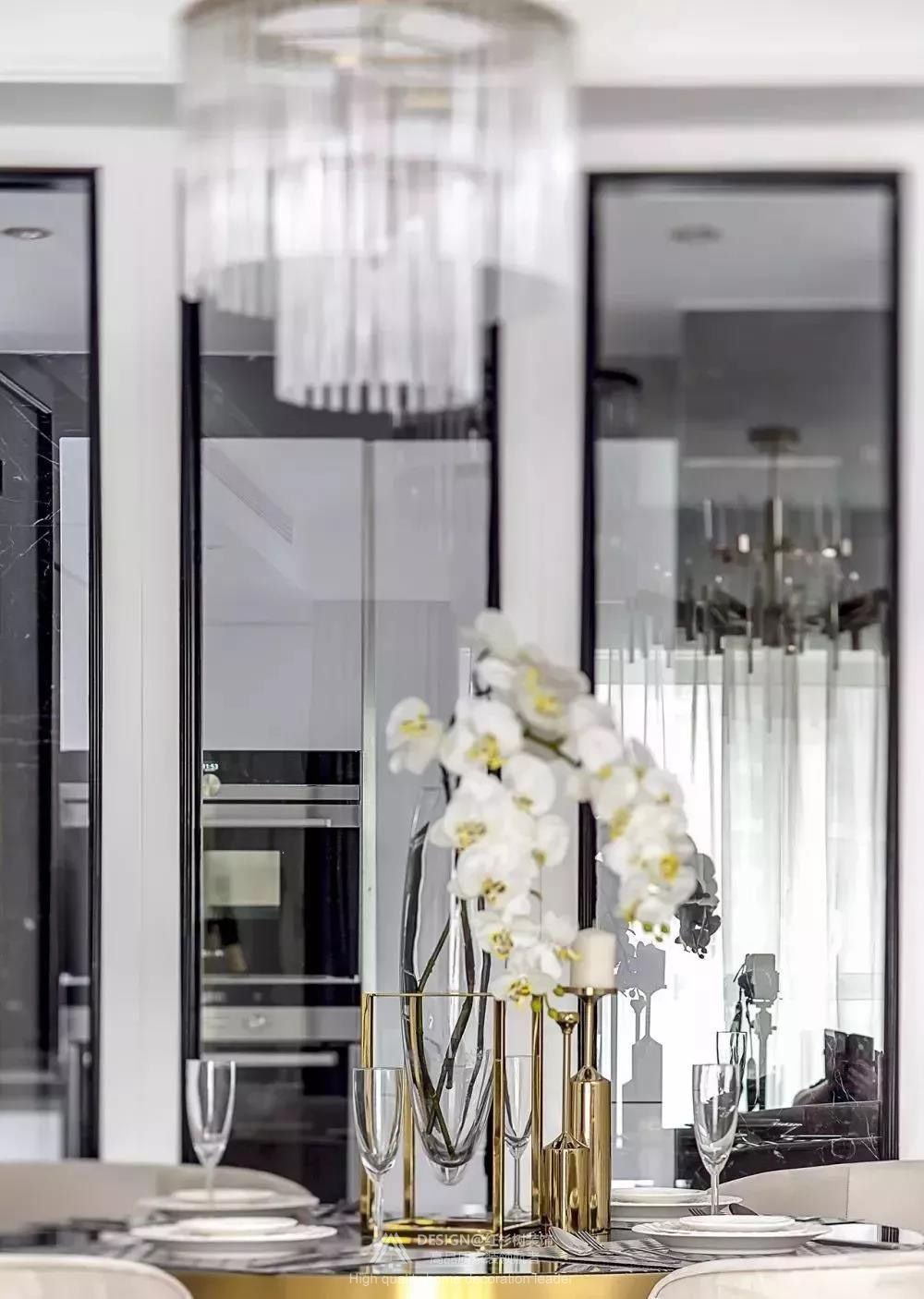 柔和精美的水晶灯、精致的餐具、金属质感的花瓶插上好看的鲜花,打造出一个温馨有质感、高颜值的用餐空间。