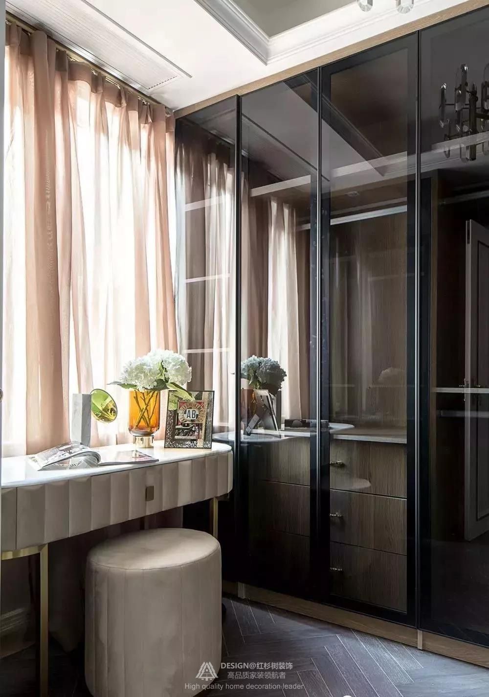 衣帽间的空间很大,黑框玻璃门时尚有个性,浅色梳妆台搭配圆凳,再摆上一瓶鲜花,能给人带来轻快惬意的感受。