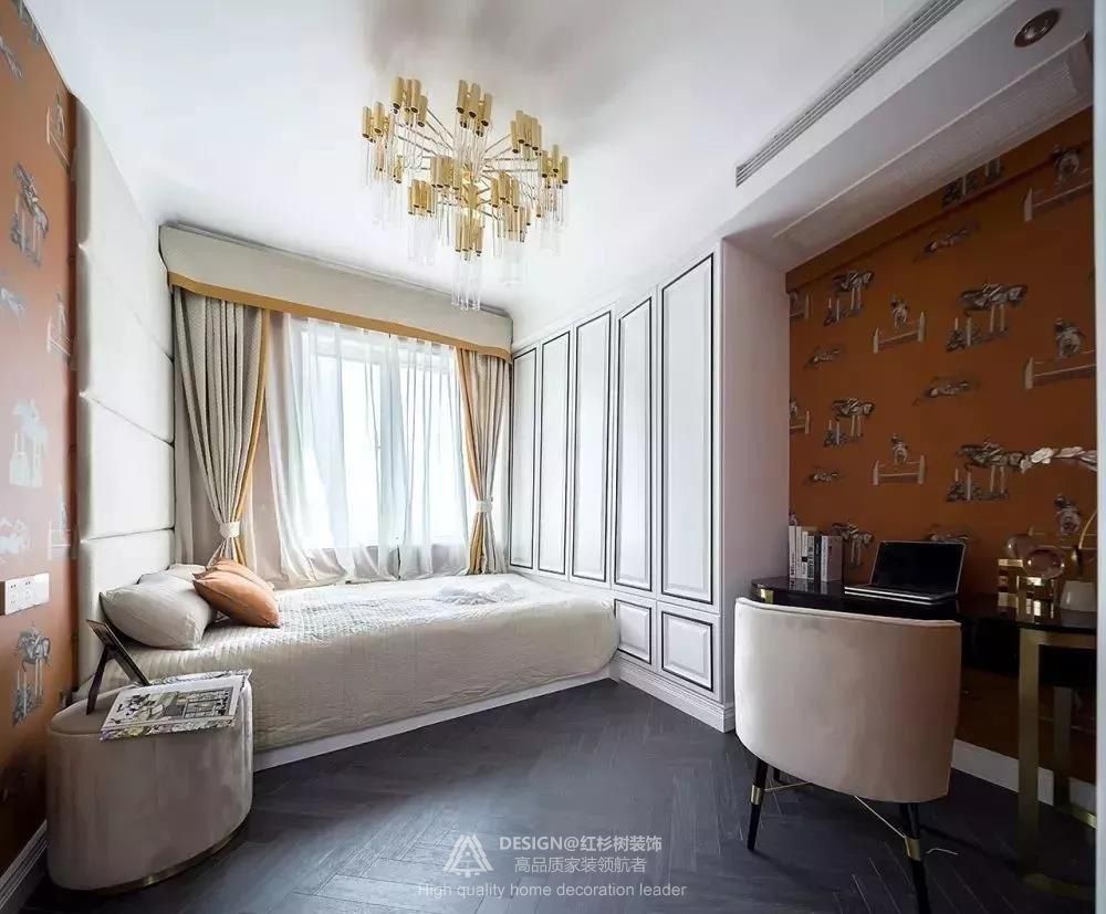 儿童房与主卧格调基本一致,素雅的白色中加入了橙色,瞬间让整个空间活跃了起来。橙色墙纸十分可爱有趣,也让空间更加丰富有层次