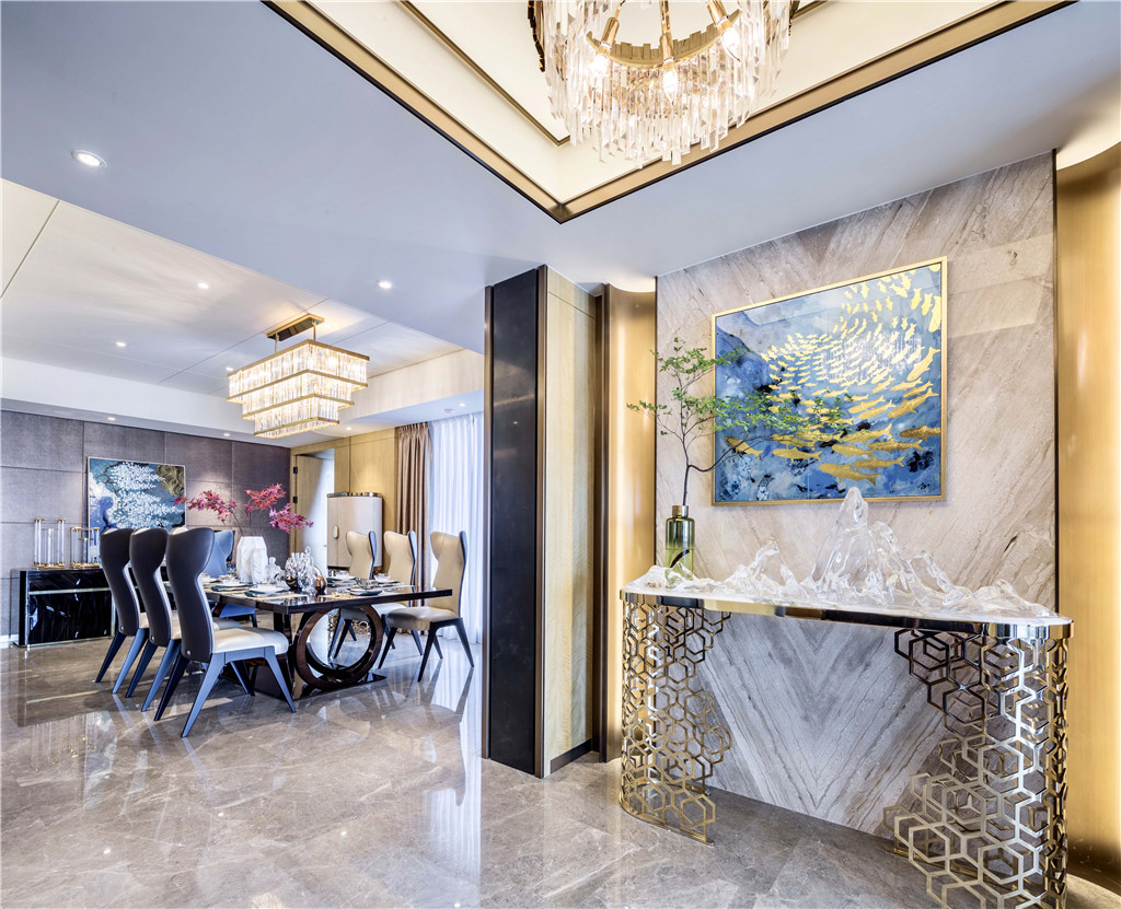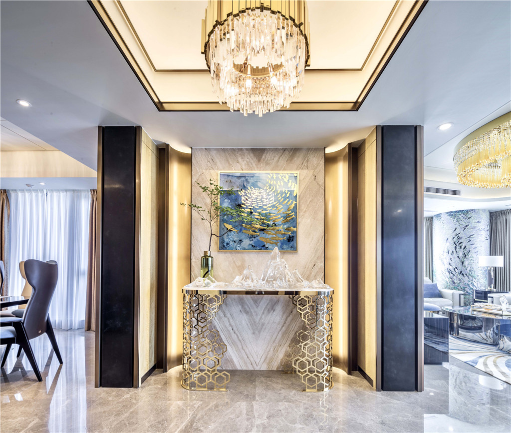 而墙面上的装饰画,“点题”,鱼与水的描金油画采用玫瑰金色画框装裱,与下面的装饰台呼应。