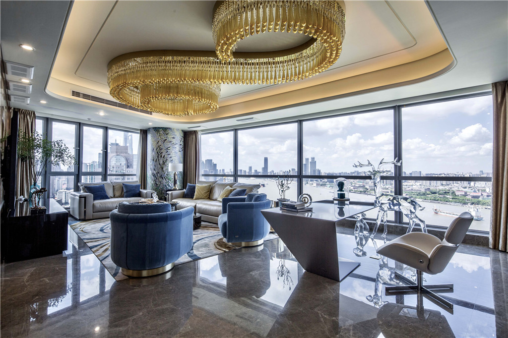 整个设计灵感来源于“如鱼得水”与窗外的江景相呼应,各种细节的设计与布置包含配饰的纹路与肌理都紧扣主题。