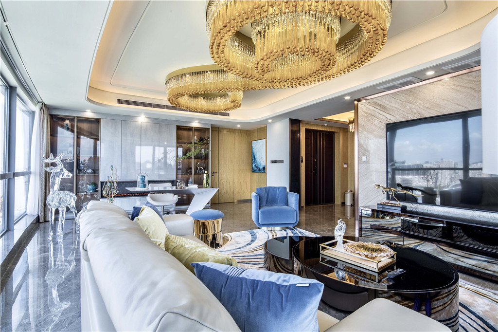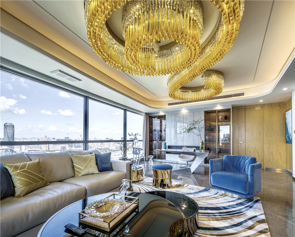 客厅,作为整个居室中更大的空间同时也是曝光度更高的空间,色调采用米灰、金、黑并用蓝作为跳色点缀。