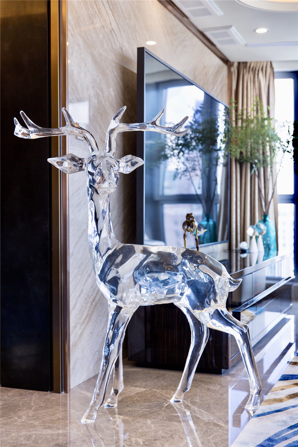 首先看到的是一座金属材质并用香槟金色电镀的装饰台,台上放置的是一座水晶山摆件。其寓意为“开门见山”,运用水晶材质给人以若隐若现犹如眺望远处山峰的感觉。