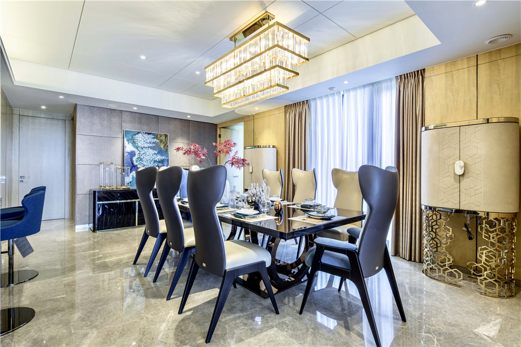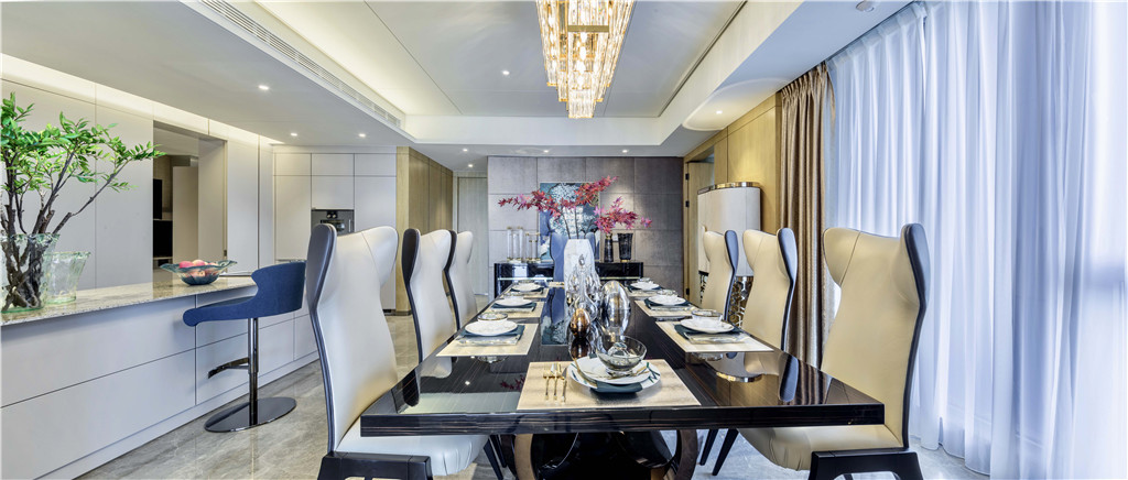 餐厅,家具也以金属,实木,为主,对称放置了两个储物柜,餐桌可供8人同时用餐。
