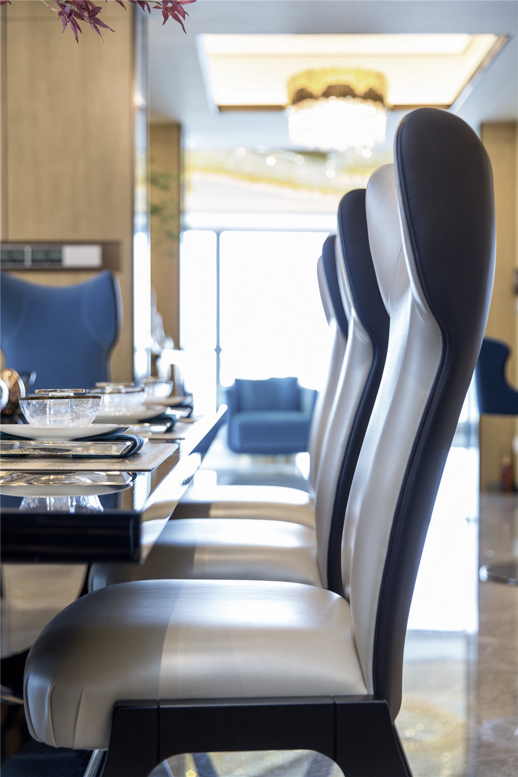 细心的人会觉得餐椅是不是尺寸太大了,与餐桌的比例已经超过了常规。这是设计师有意而为之,意在用餐的时候能显得更有仪式感。
