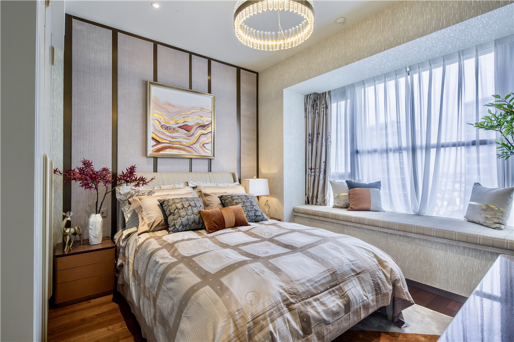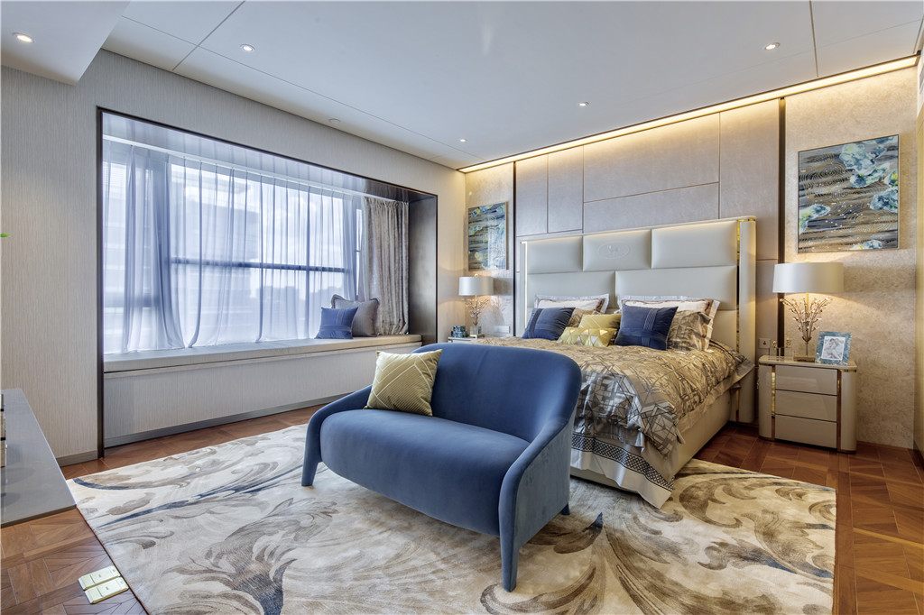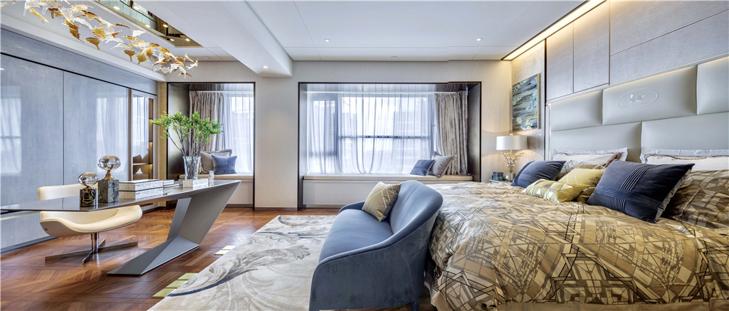 主卧,色调相较于客厅、餐厅没有那么浓重。以米色、米灰色、暗金色为主,同样以粉蓝做跳色点缀。
