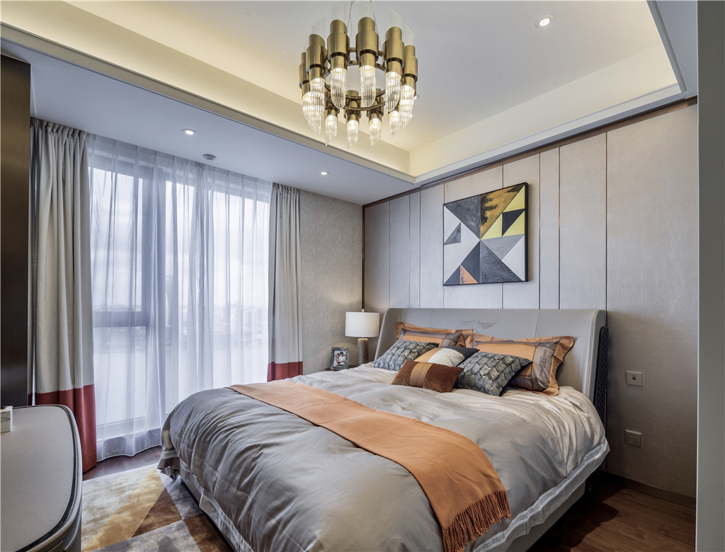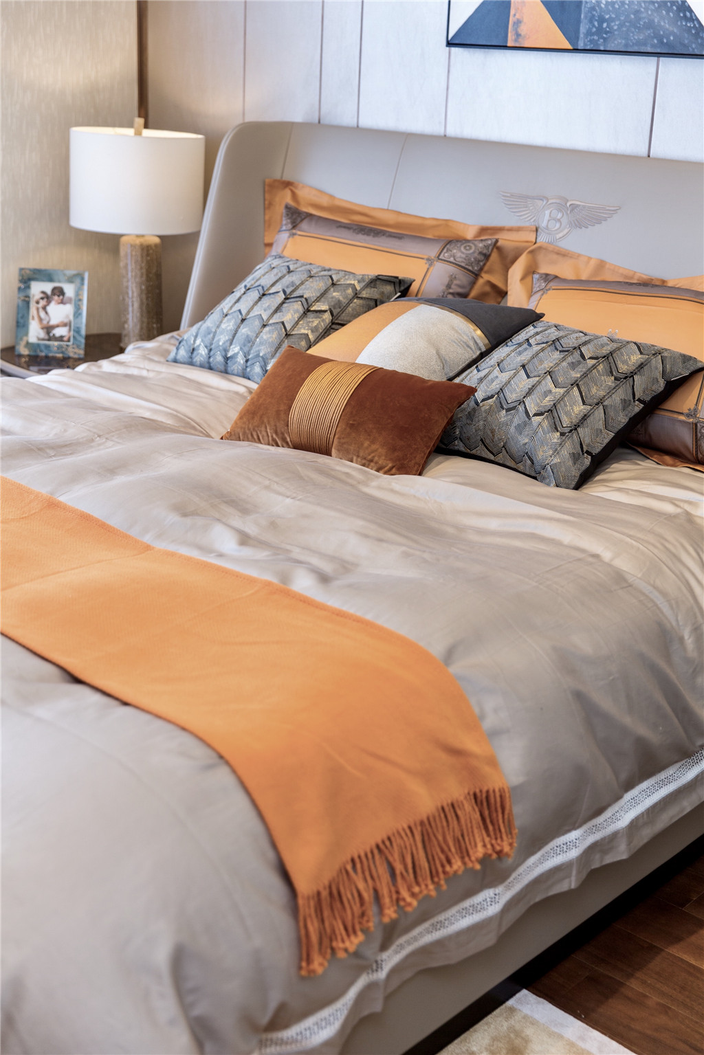 枕头和床尾巾选用了橙色,包括窗帘也是酒红与灰色相拼,这样的设计让整个空间不会显得过于单调。