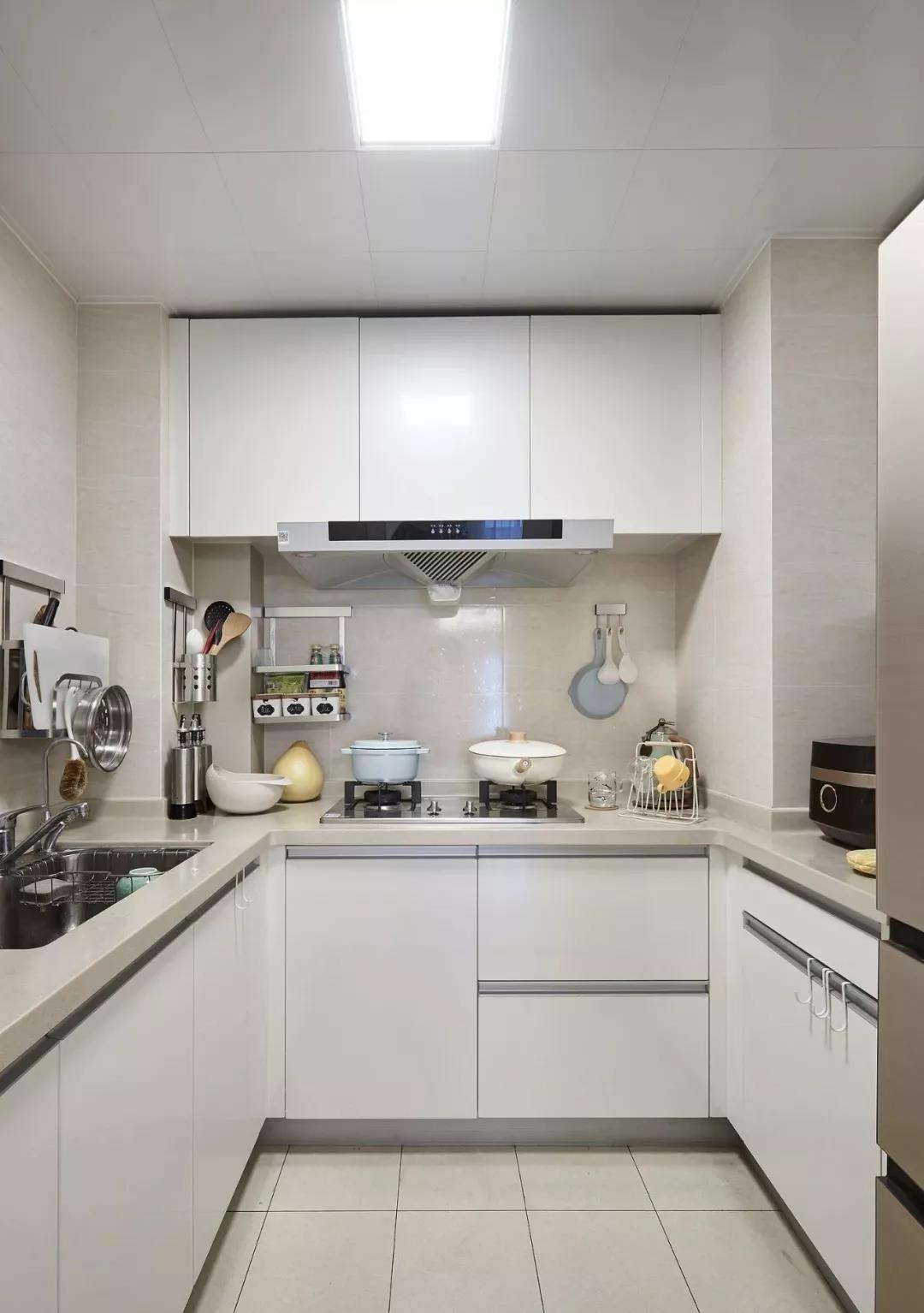 厨房内部做了U字型的橱柜布局,白色的橱柜搭配浅灰色的墙地砖和台面,显得年轻大方。厨房的墙面除了吊柜外,也做了其他的收纳,满足不同的收纳需求。
