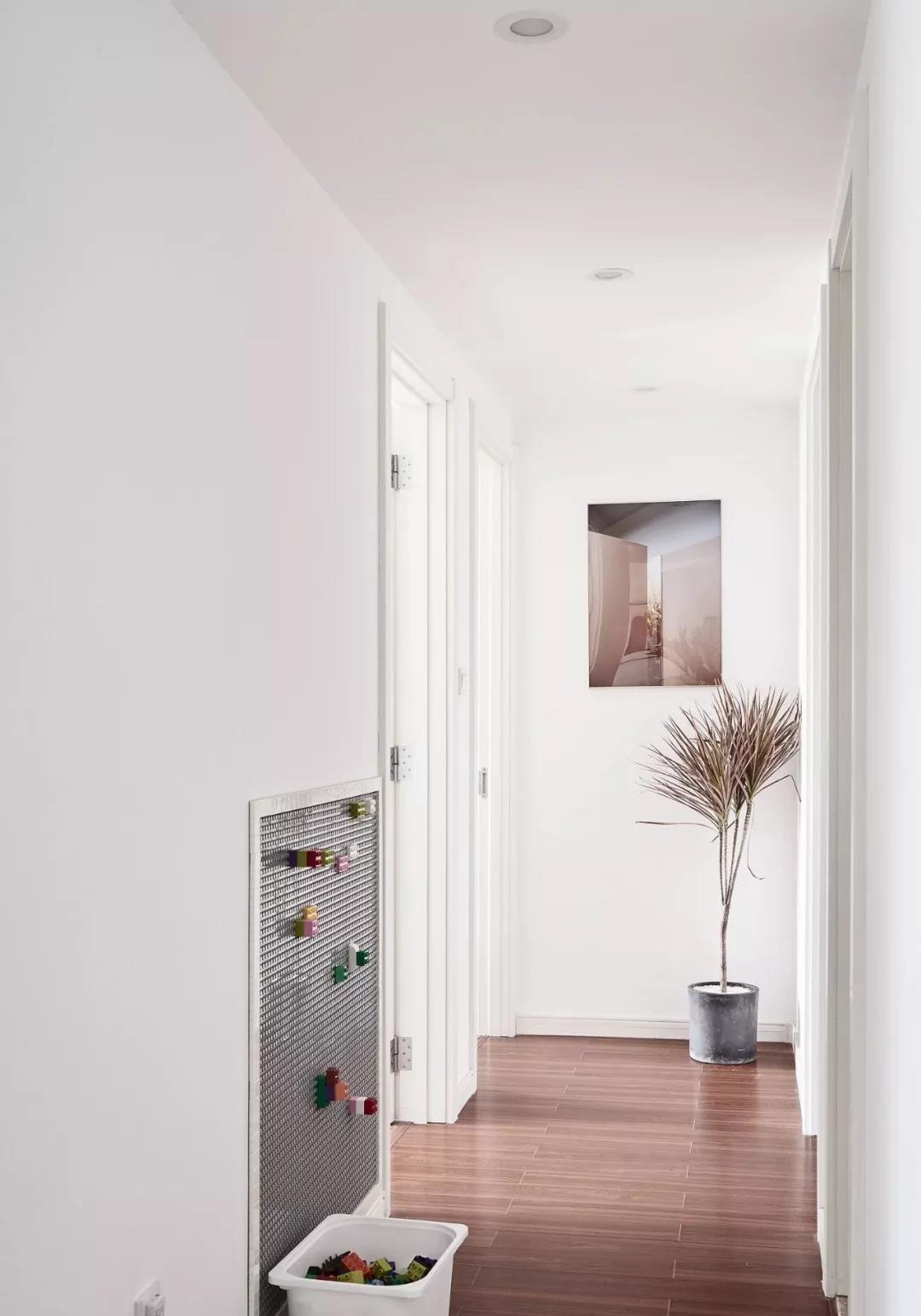 通往卧室的走道过道,地面延续了客餐厅的木地板设计,在儿童房的门外还做了个创意的玩具墙,方便孩子玩耍。