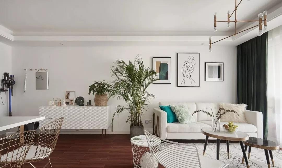 在餐厅的侧方还摆放了矮柜辅助收纳,餐厅和客厅之间摆放一个绿植作为隔断,白色的沙发背景墙上挂着几幅简洁挂画,简单大方。