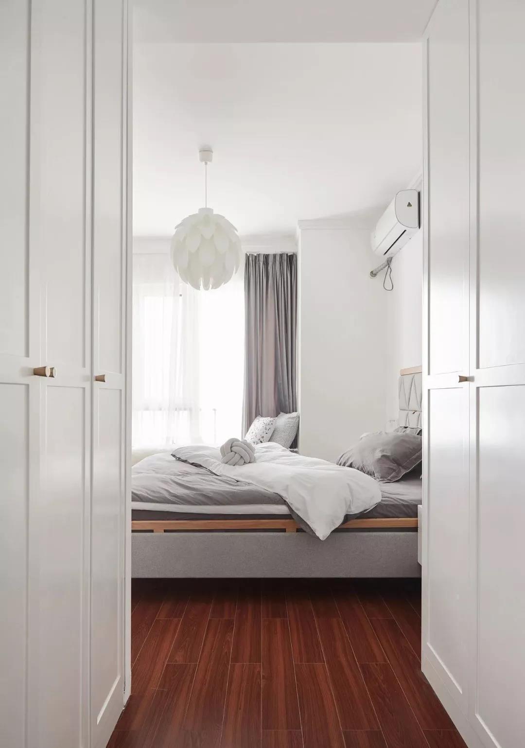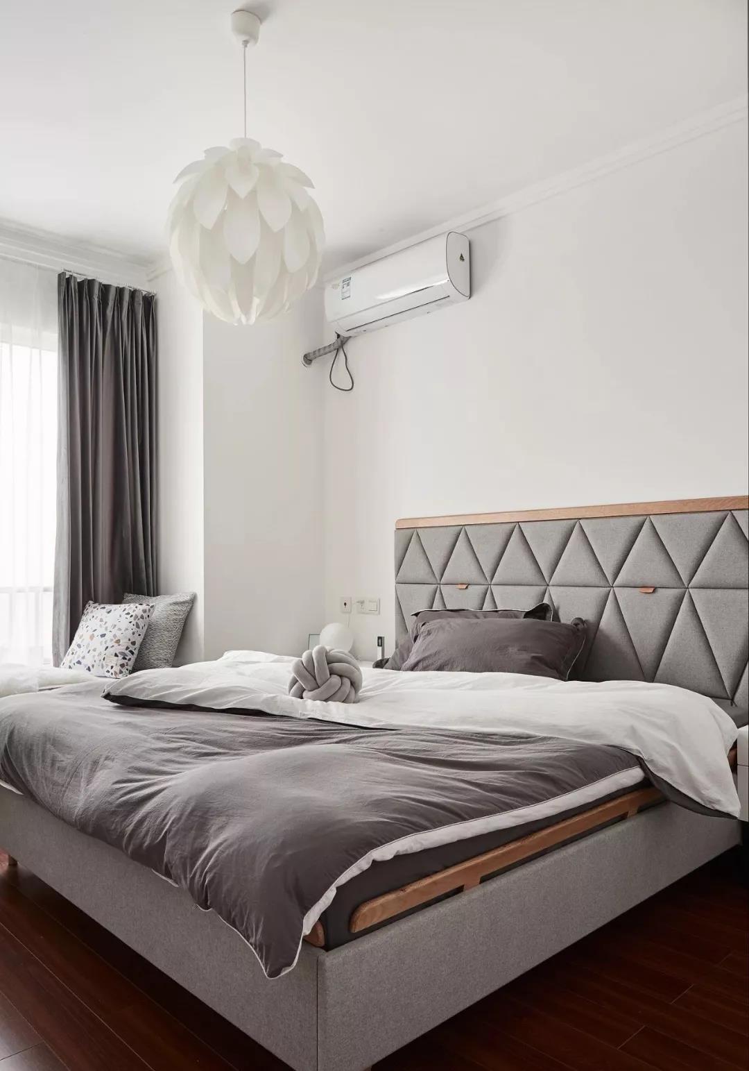 主卧室以白色和灰色为主,白色的墙面和灰色的窗帘、床品结合起来,床头靠背做了几何造型,整个卧室显得轻松而又舒适。