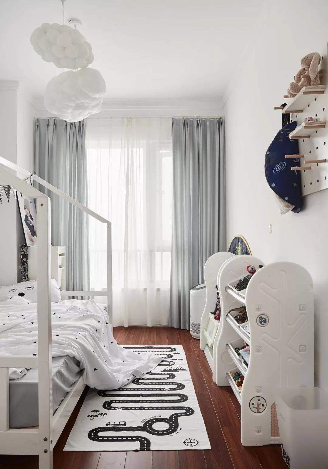 儿童房内的床选择了卡通款式的,在床的侧方还摆放了地毯和玩具架,墙面一个洞洞板也能增强儿童房内的储物空间。
