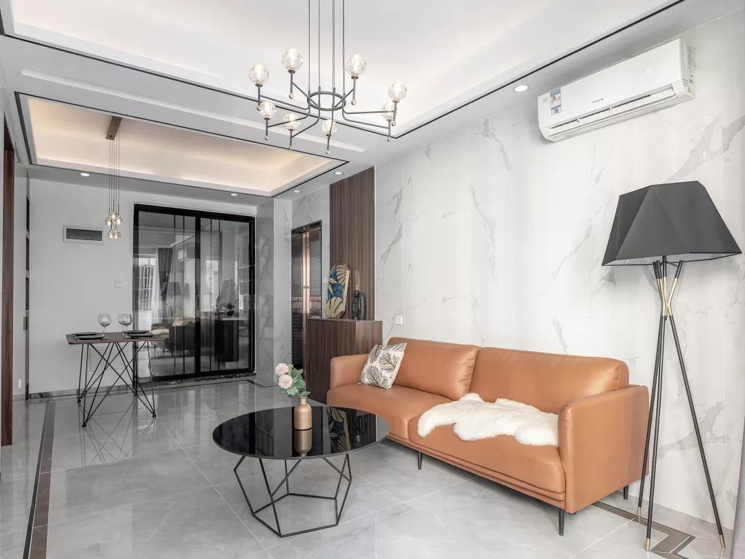客厅的沙发背景墙是铺贴了大理石瓷砖,橙色的皮沙发让客厅看起来更有档次,沙发、茶几的款式都不复杂,延续了整体简洁的装修风格。