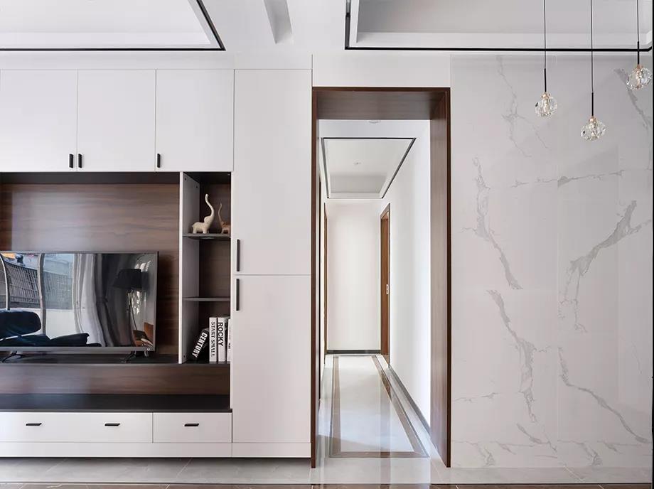 通往卧室的走廊过道,也是延续了客餐厅的灰色瓷砖加波导线的设计,上方的吊顶也加了一圈装饰线条,上下呼应看起来简洁又大方。