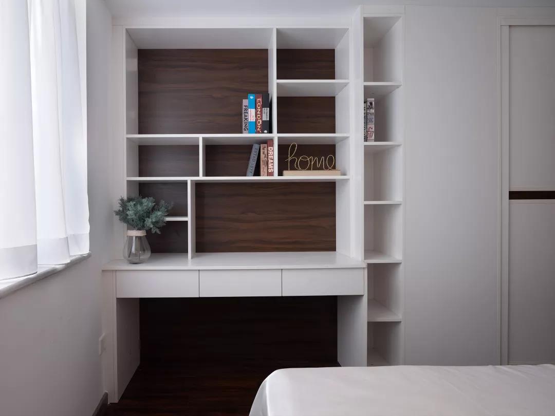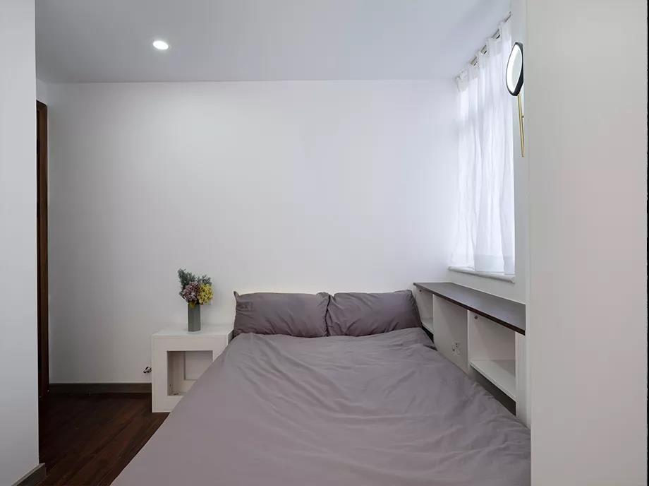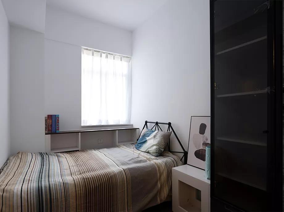 次卧的床选择了靠着窗户摆放,迷你的飘窗区被改成了柜子,让次卧多出一些储物空间,在这里放几本书,晚上看的时候也方便很多。