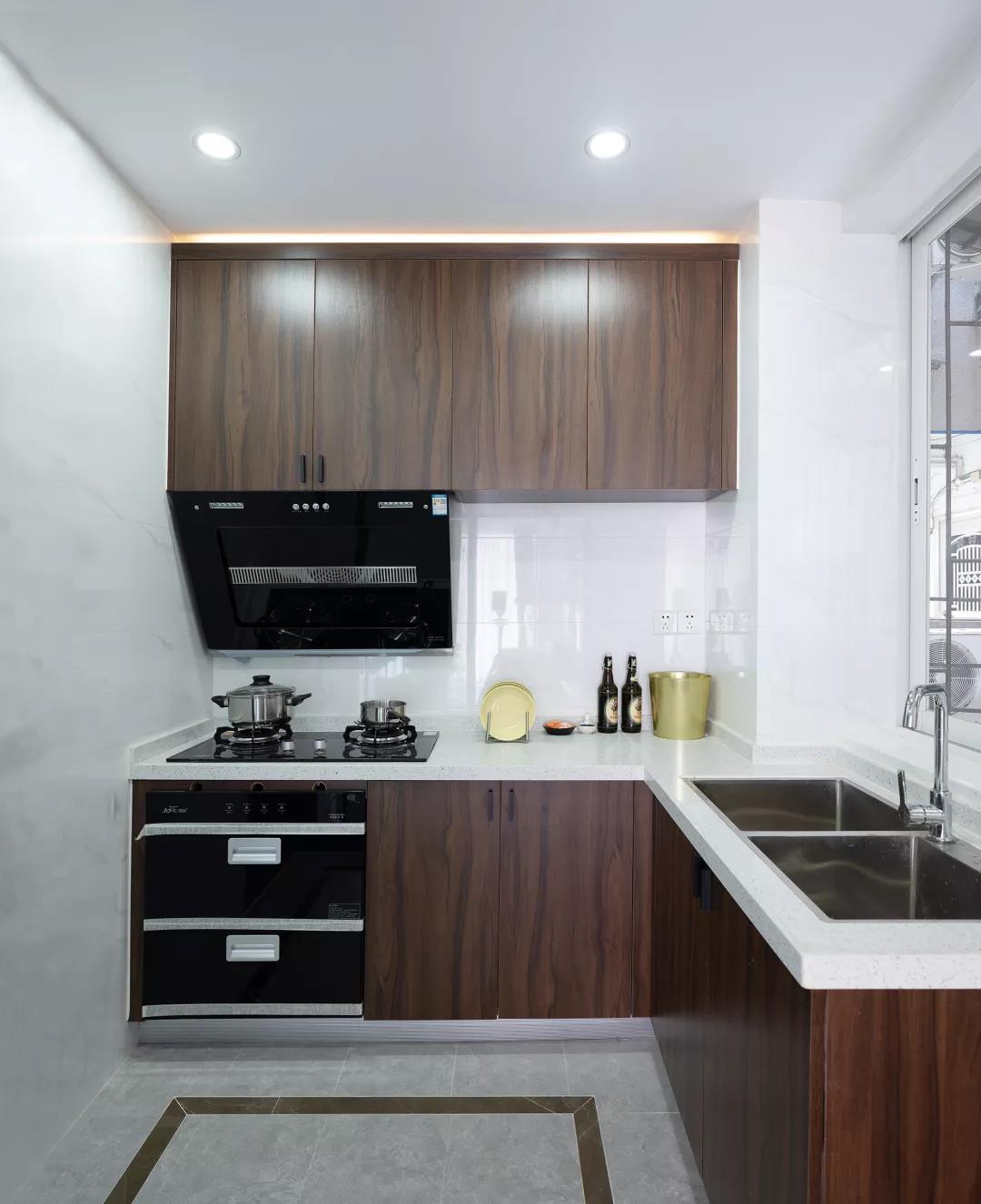 厨房内部的橱柜做了L形的布局设计,深木色的柜门搭配白色和灰色的瓷砖,让厨房的层次感得以提升。