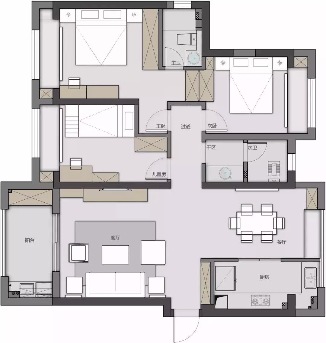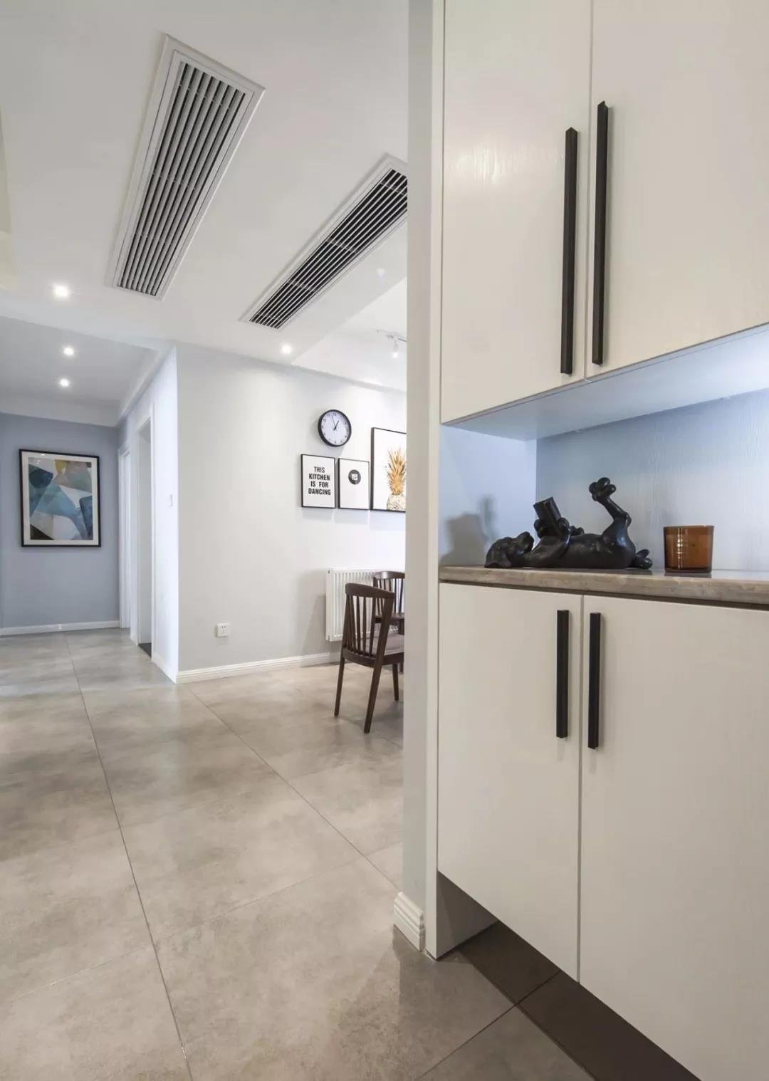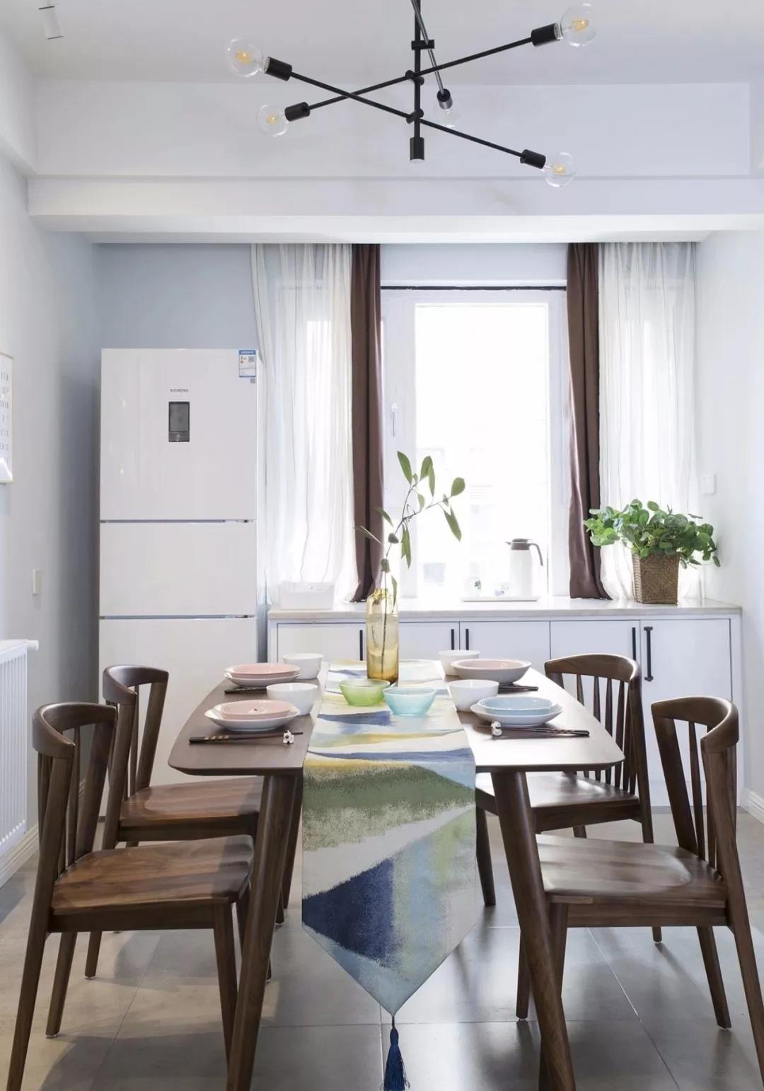 餐厅整体硬装设计延续客厅的格调,窗边矮柜+冰箱的组合,很好的分担了厨房一部分的功能。