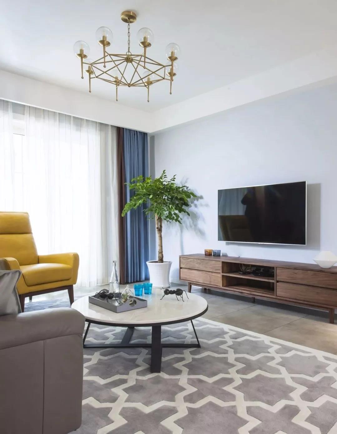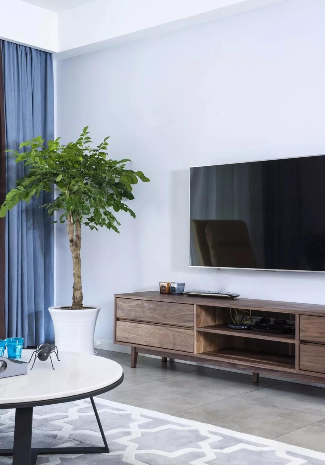 浅蓝色的乳胶漆墙面搭配胡桃木电视柜,边上放一盆幸福树,让一切简单变得生动自然。