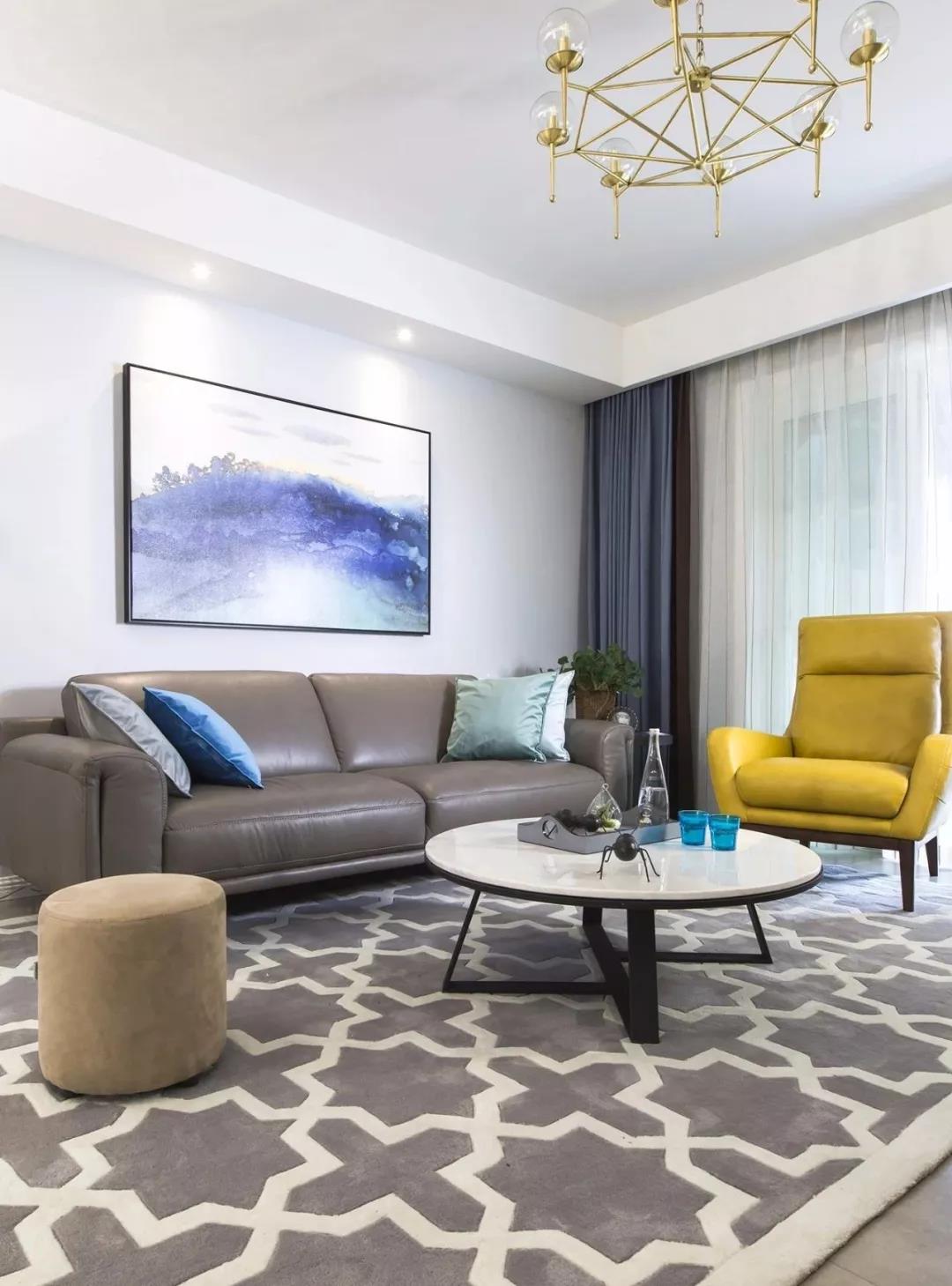 灰褐色皮质主沙发,沙发上的靠枕色调与装饰画颜色呼应,柠檬黄的单椅,是家里的亮色。