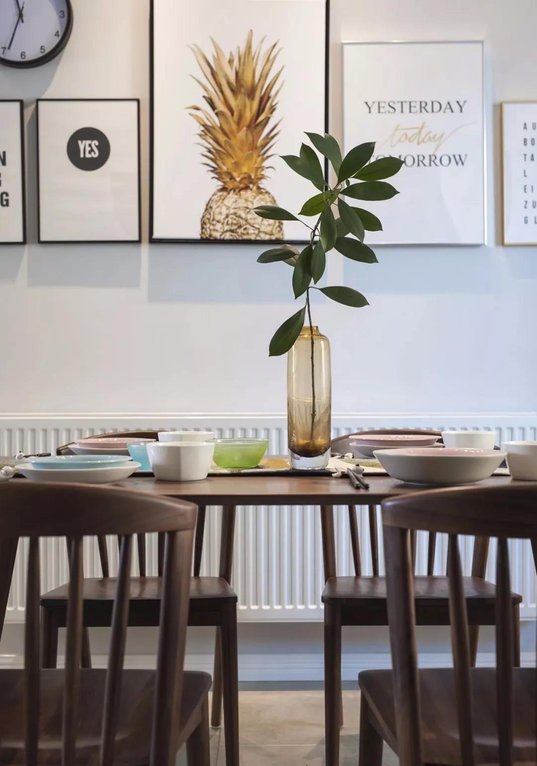 胡桃色的原木餐桌椅,简单又实用,采用系列简框画与挂钟丰富背景。