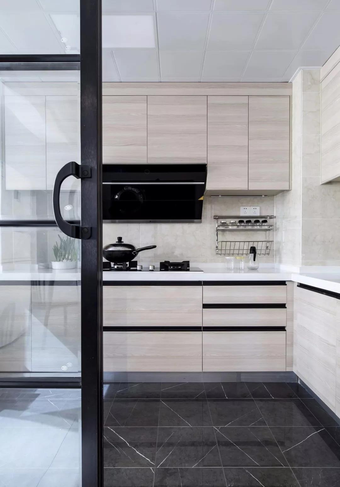 厨房,深色地砖搭配浅色墙砖,木纹橱柜门,整体简单但功能全面。