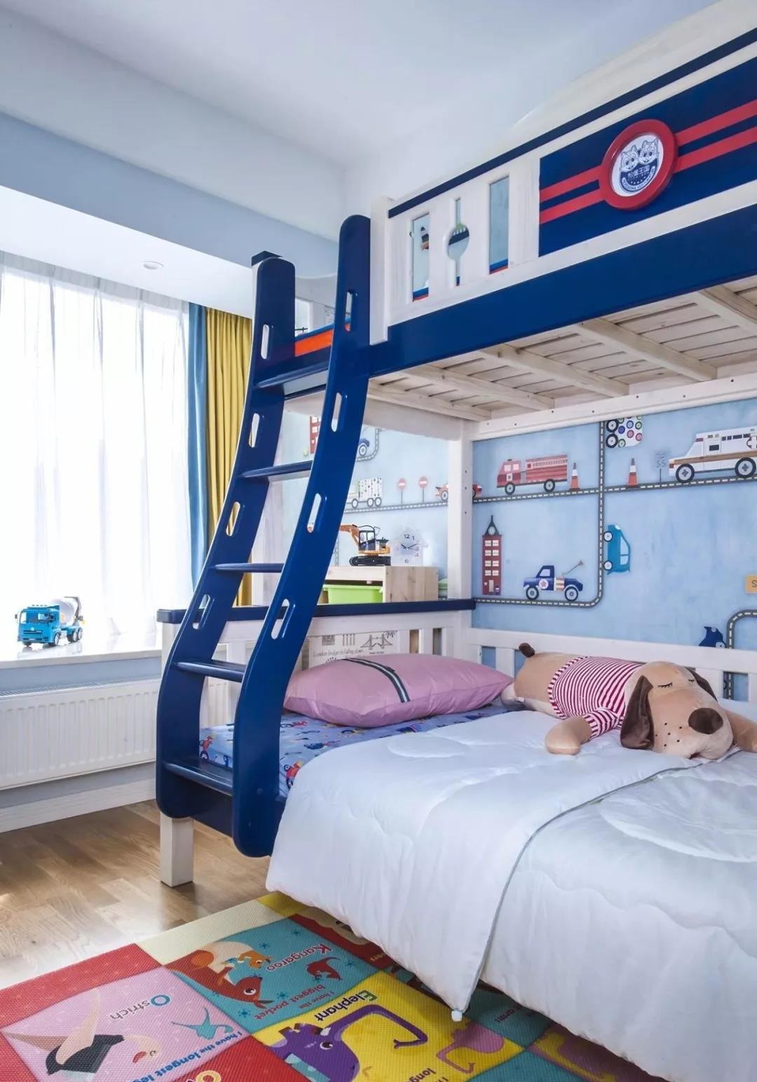 儿童房,整体以蓝色为主题,蓝色基底的汽车壁纸铺贴出童趣背景。