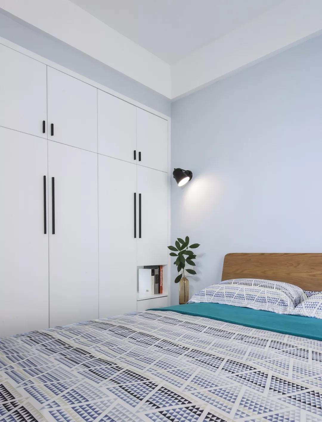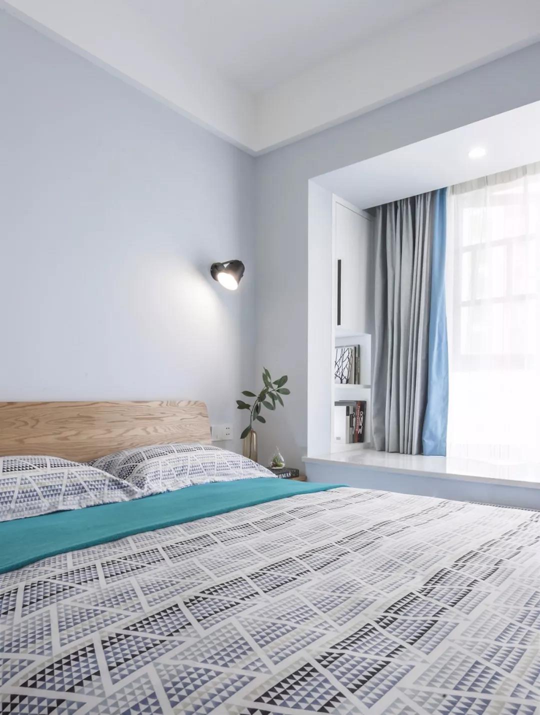 主卧,整体以蓝灰白为基调,利用飘窗台上的死角设计收纳功能。