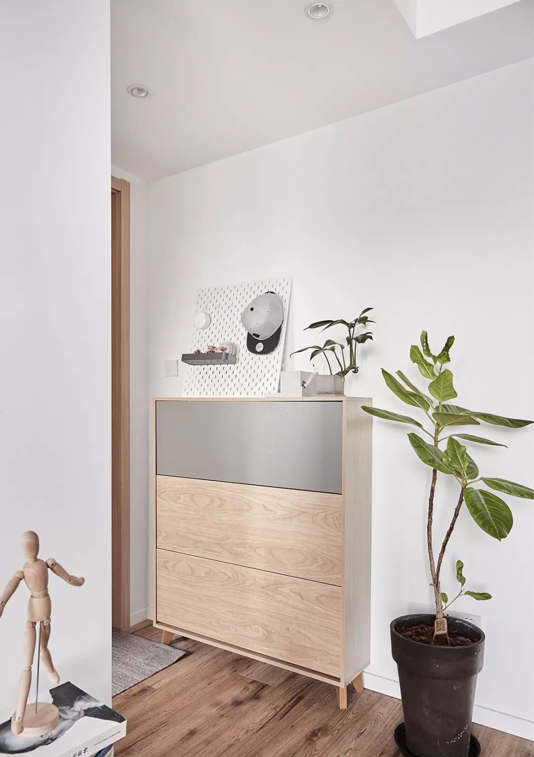 玄关距离短且狭窄,选择了一款体积小颜色轻的成品鞋柜,搭配一张灰色地毯,形成室外进入室内的完美过渡。