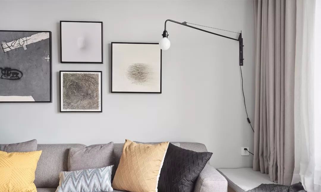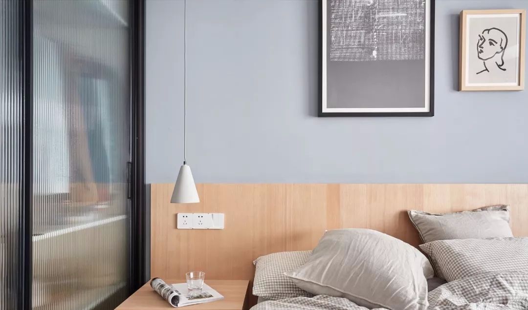 墙面刷了淡绿色乳胶漆,很清新。工业风的壁灯,灯泡瓦数不高,入夜后氛围很棒。用挂画摆脱无聊墙面。