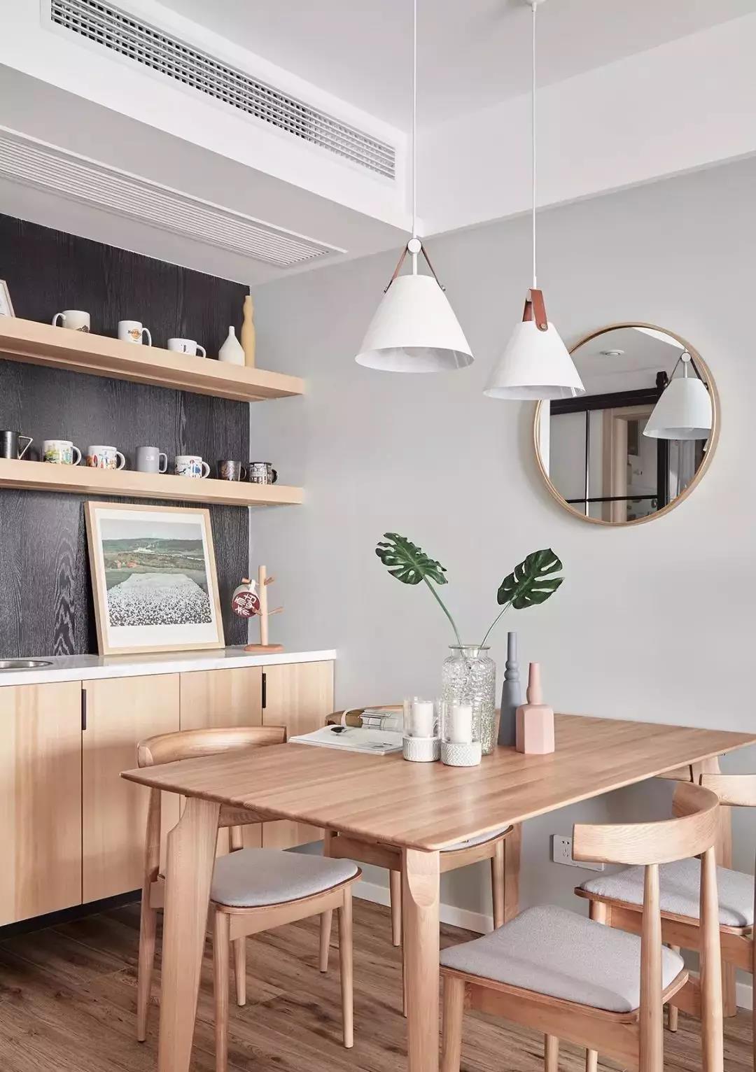 简单清爽的原木色餐厅,一旁带水吧功能的餐边柜,加装咖啡机、净水器和自动热水壶等设备,幸福指数大大提升。