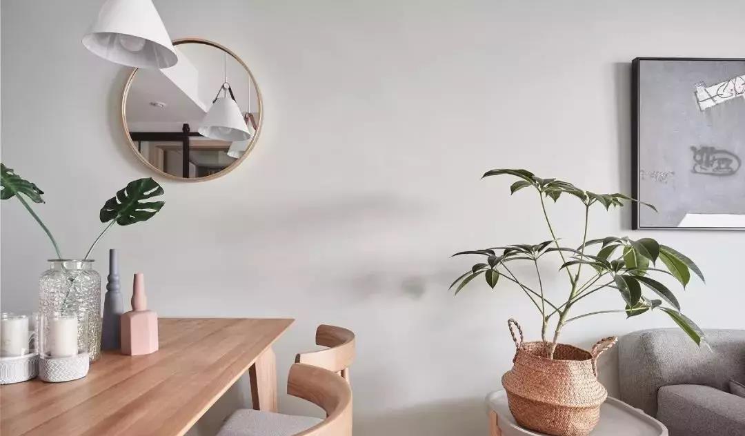 客餐厅之间无明显 的隔断,水发旁边的边几上放着一盆绿植,即为客餐厅的分隔,也让两个功能区之间形成联系。