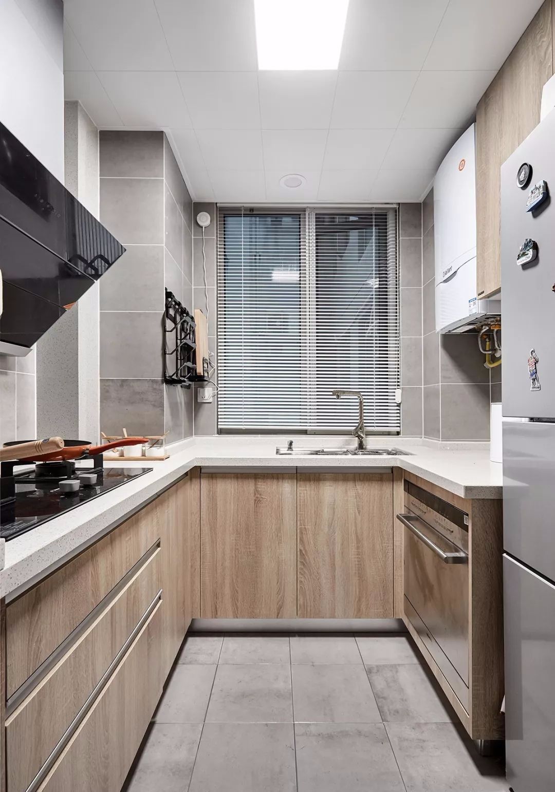 4平米的厨房设置、收纳一应俱全,橱柜配色与整体风格保持一致,墙砖地砖均选用了灰色水泥砖,沉稳耐脏。